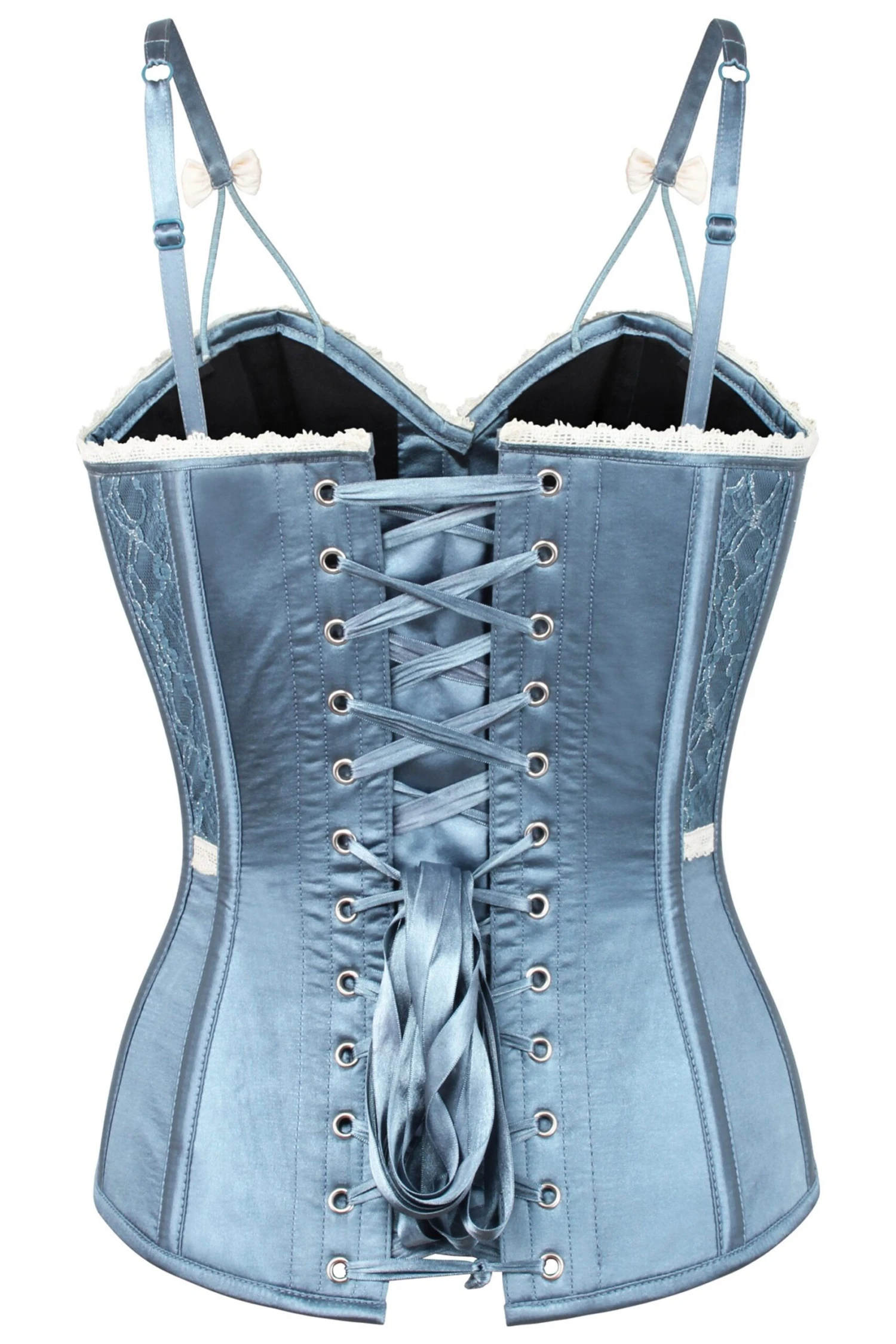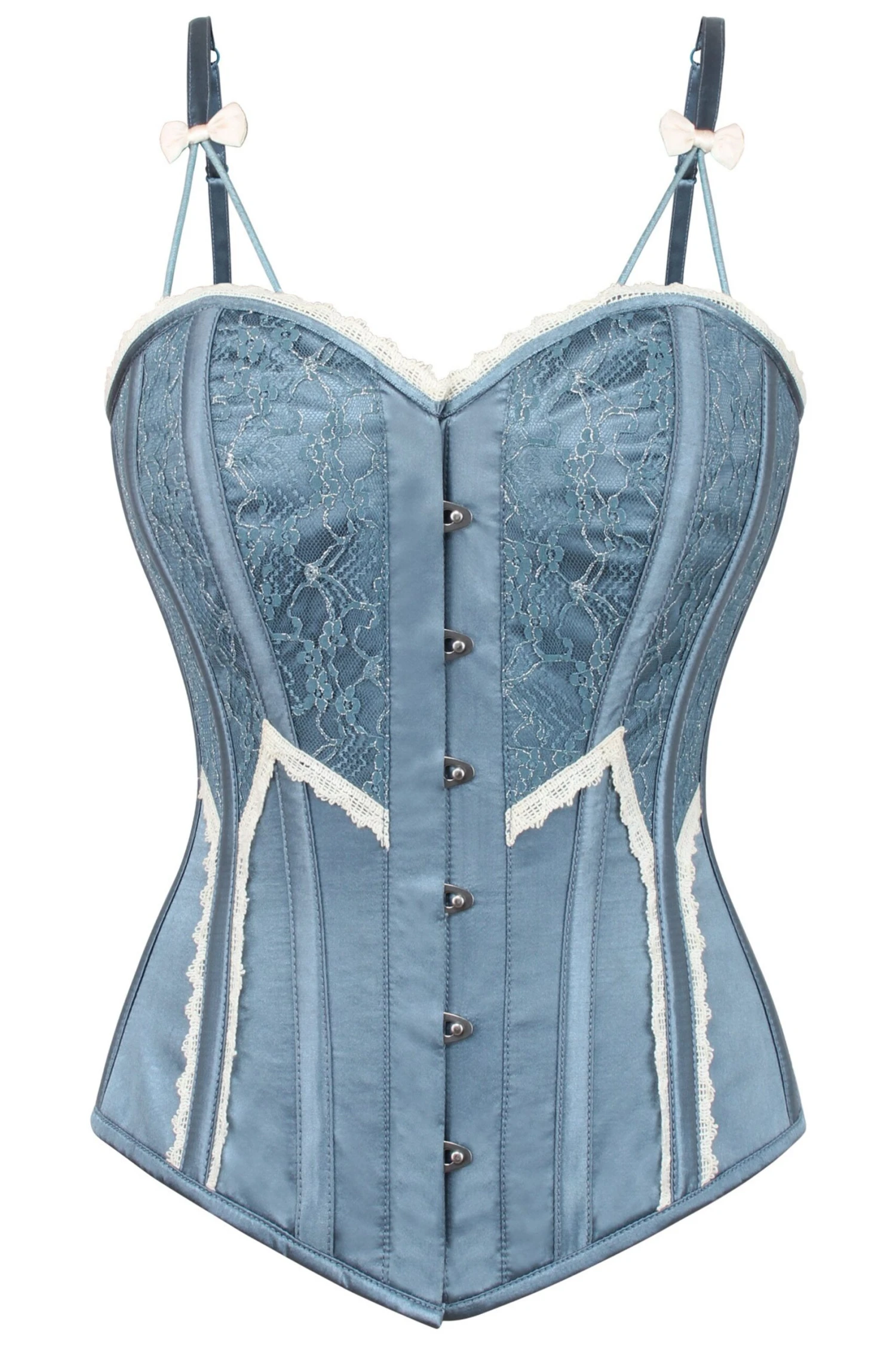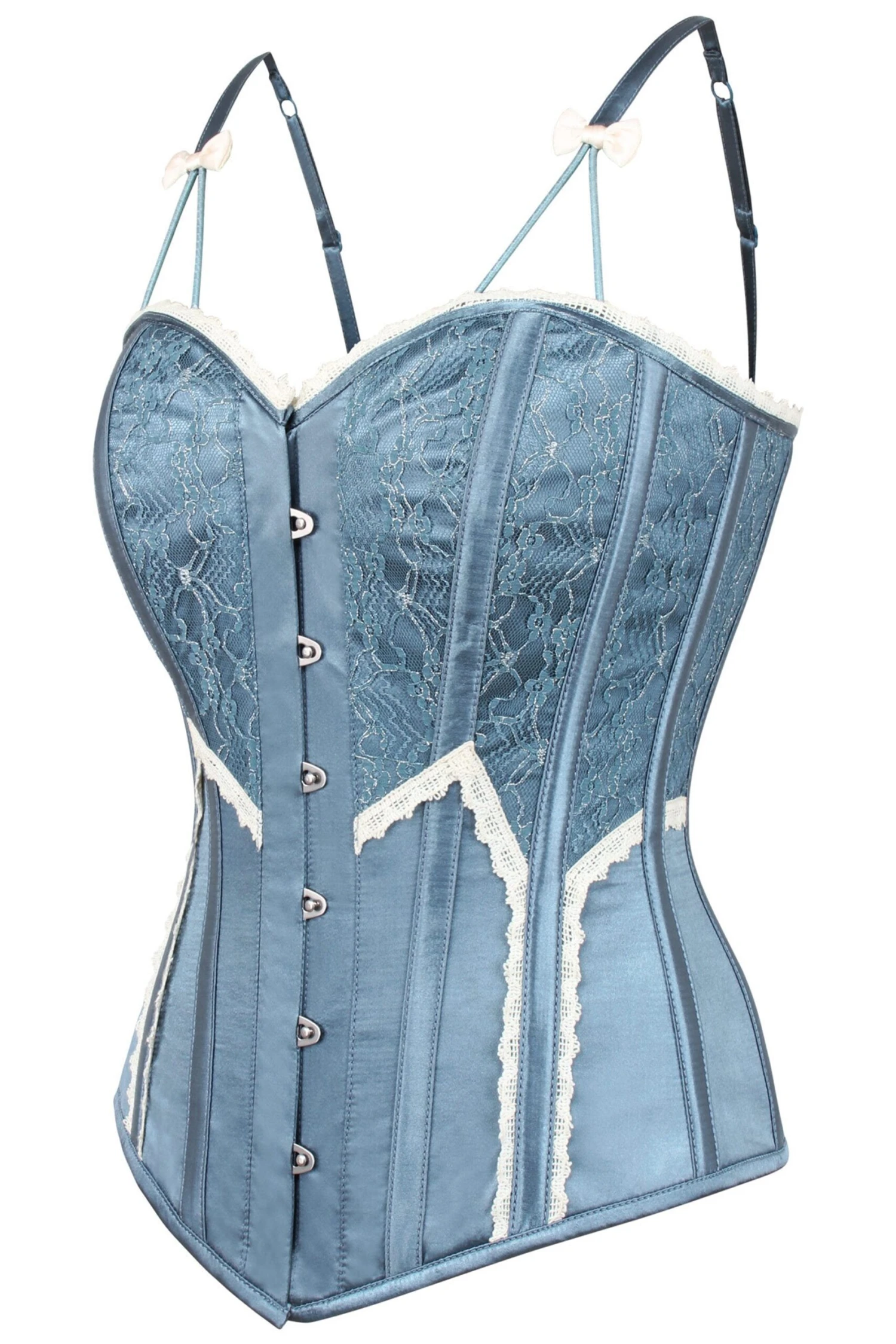 Soft yet sexy, this ultra-feminine overbust is the design your lingerie wardrobe needs. Featuring a dusky blue satin with two-tone shimmered lace overlay, this antique inspired corset offers a waist reduction of 2”, for the feminine form and definition that is guaranteed to turn heads.