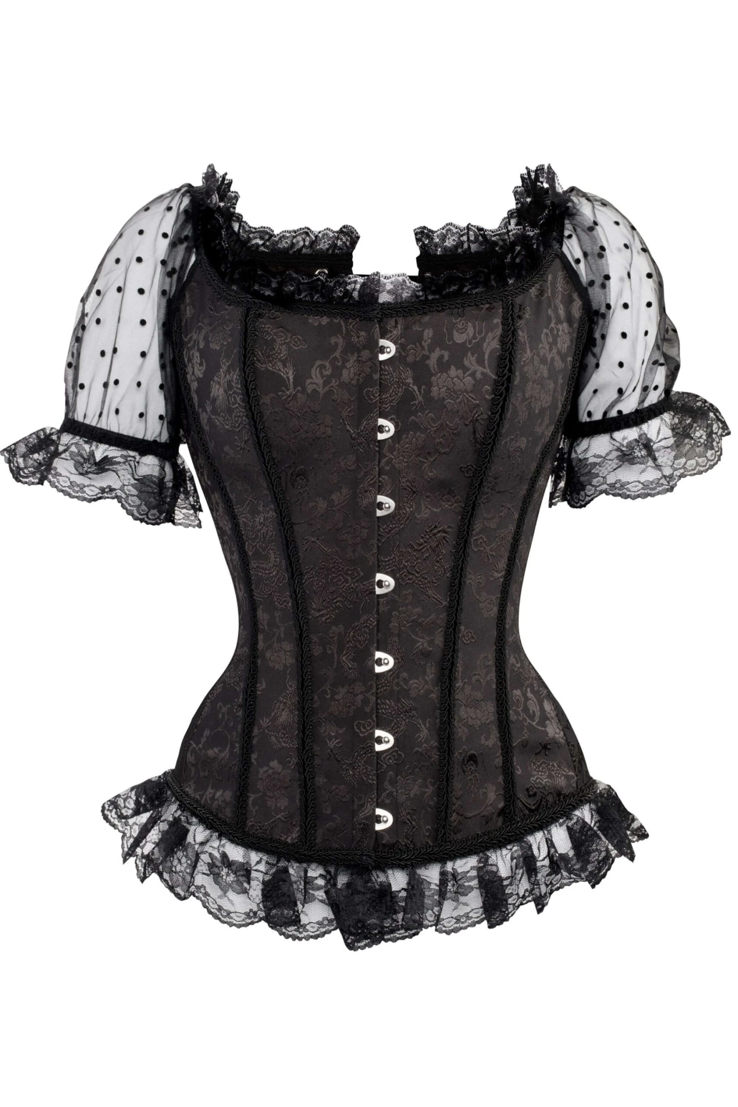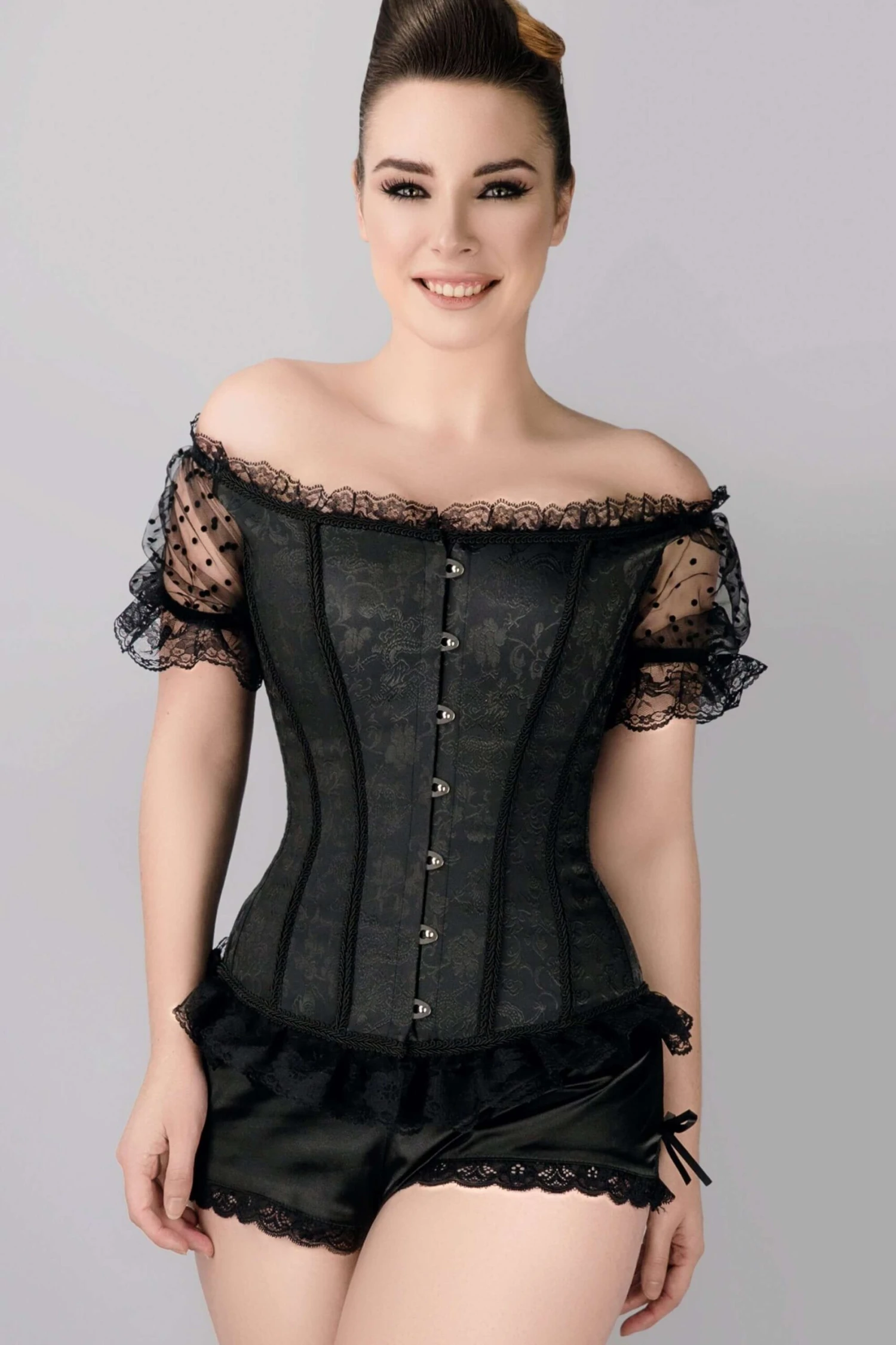 This is a brand new addition to the Corset Story catalogue and part of our ever-increasing Instant Shape range. This black overbust corset featuring a court neck and sleeves is finished with a delightful and intricate brocade pattern which demands to be shown off at any opportunity. This corset – as with all of our Instant Shape garments – is spiral steel boned but still incredibly lightweight. This allows complete freedom of movement, yet still offering a small waist reduction of 1-2 inches – enough to drop a dress size in seconds and is a perfect ‘starter’ corset. Anyone looking for a more dramatic waist reduction should check out our Waist Taming or Expert Waist Training sections.