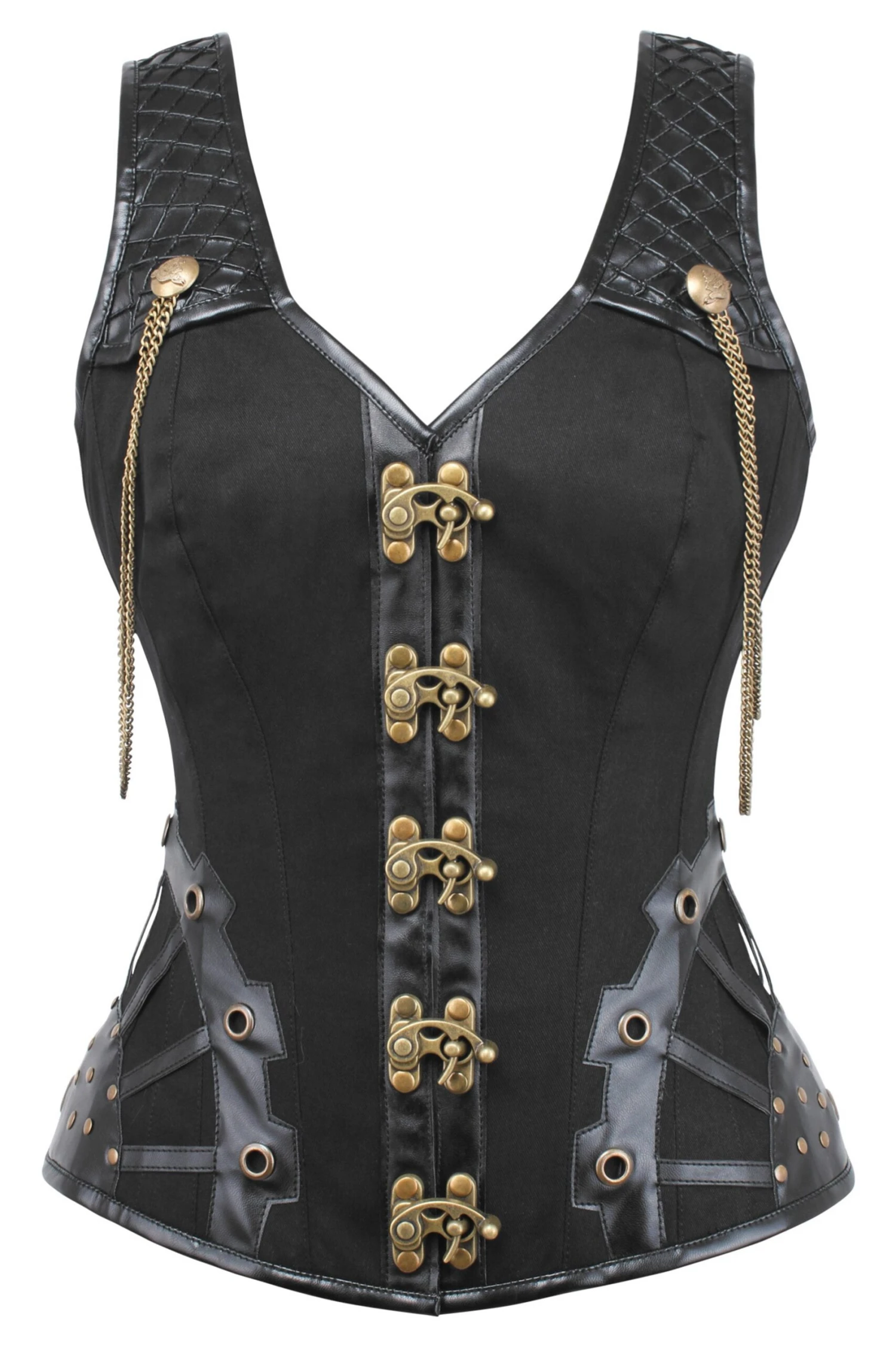 - Corset Design Features: Quilted Leatherette Straps, Buckle and Chains, Steampunk Latch Clips, Steampunk Appliqué with Eyelet and Press-studs, Hip Gores