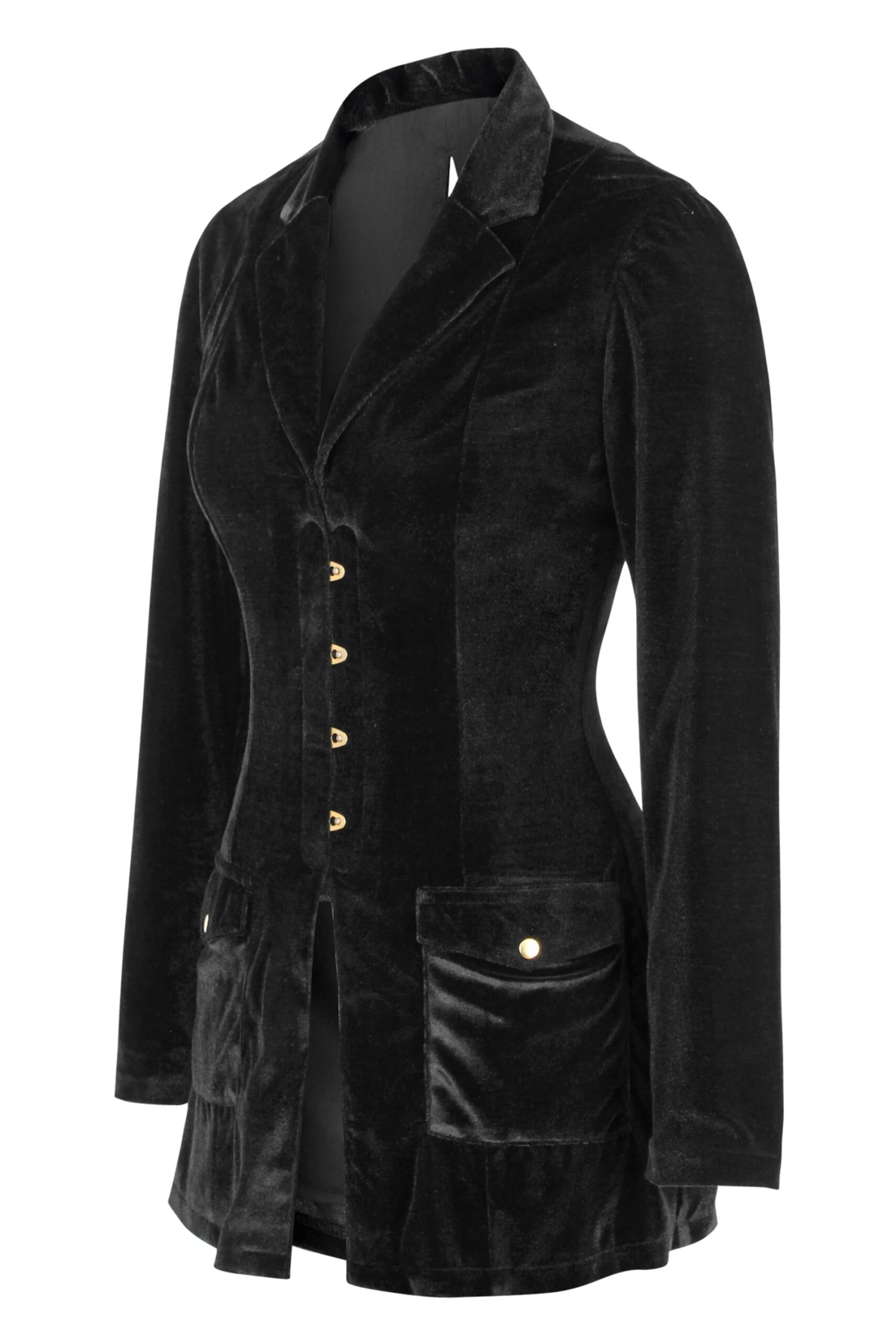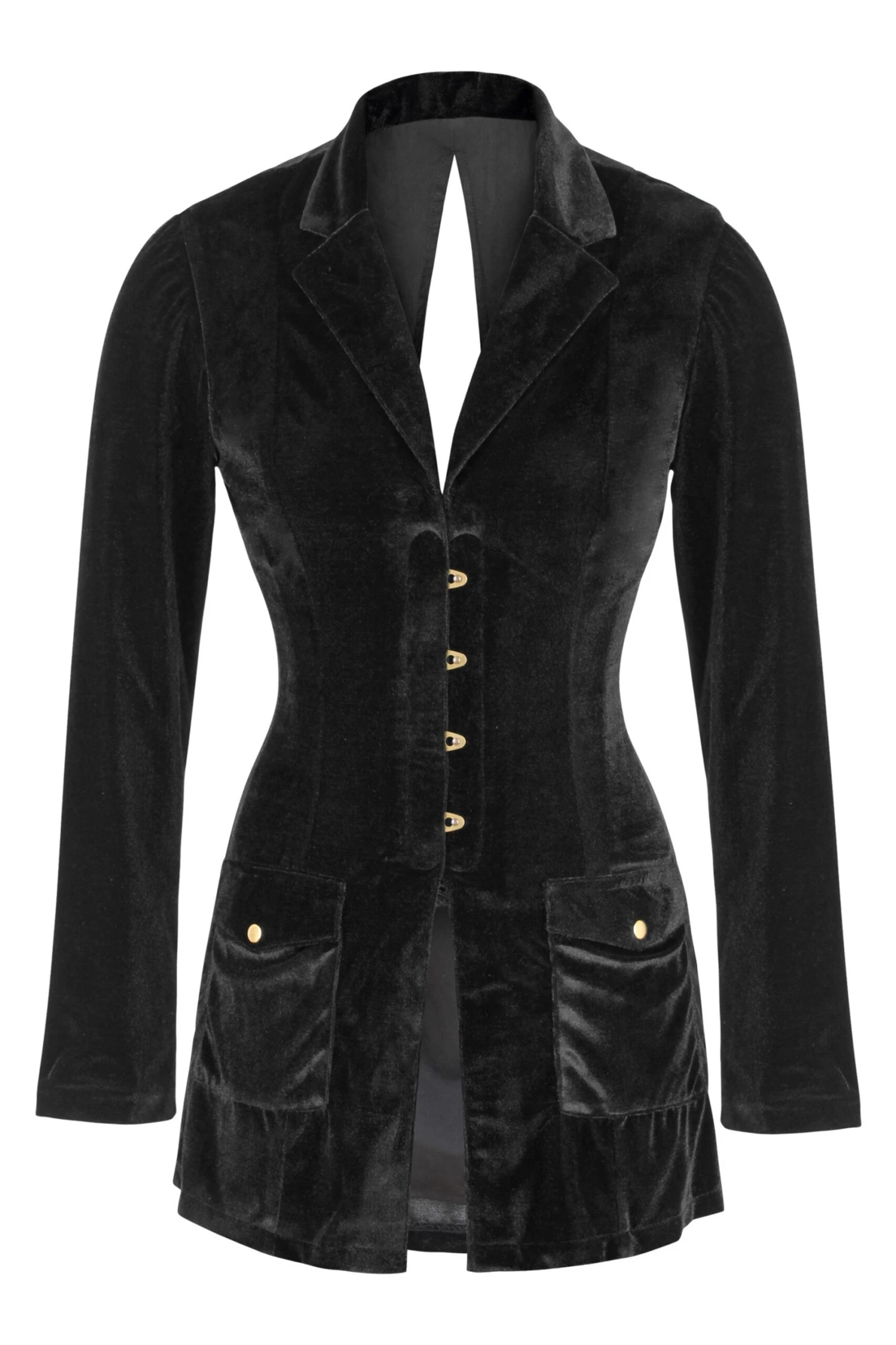Our stunning midnight black velvet coat contains an integral corset that will give you a waist reduction of up to four inches. Perfect t for evening wear, this elegant jacket features an underbust corset that will act as shapewear over any outfit. The luxurious velvet finish makes this perfect for formal wear. The jacket is beautifully finished with functioning pockets and matching gold buttons at the front, pockets and sleeves.