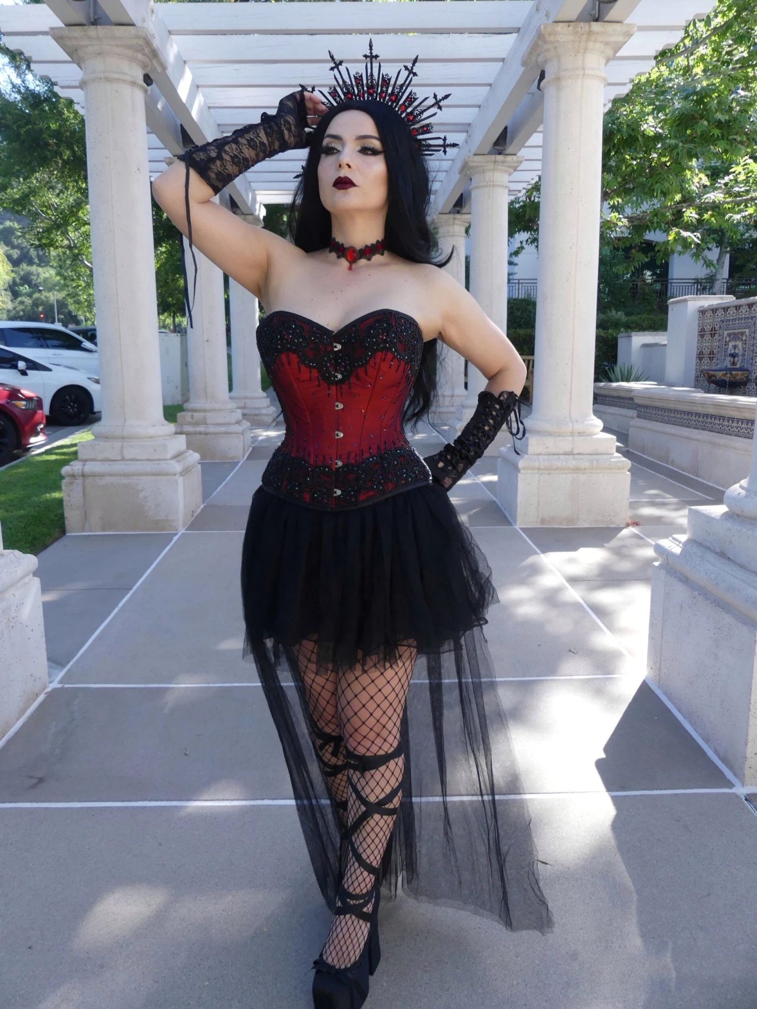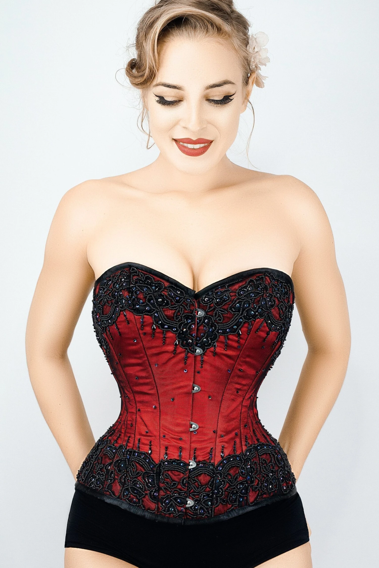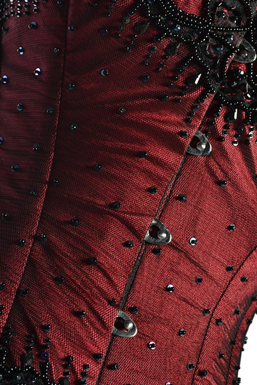 A demure and sophisticated deep red evening wear corset with beautiful black embroidery and stunning embellishments across the bust and bottom edge. This is a superb, handcrafted corset that brings something very show stopping to any occasion.