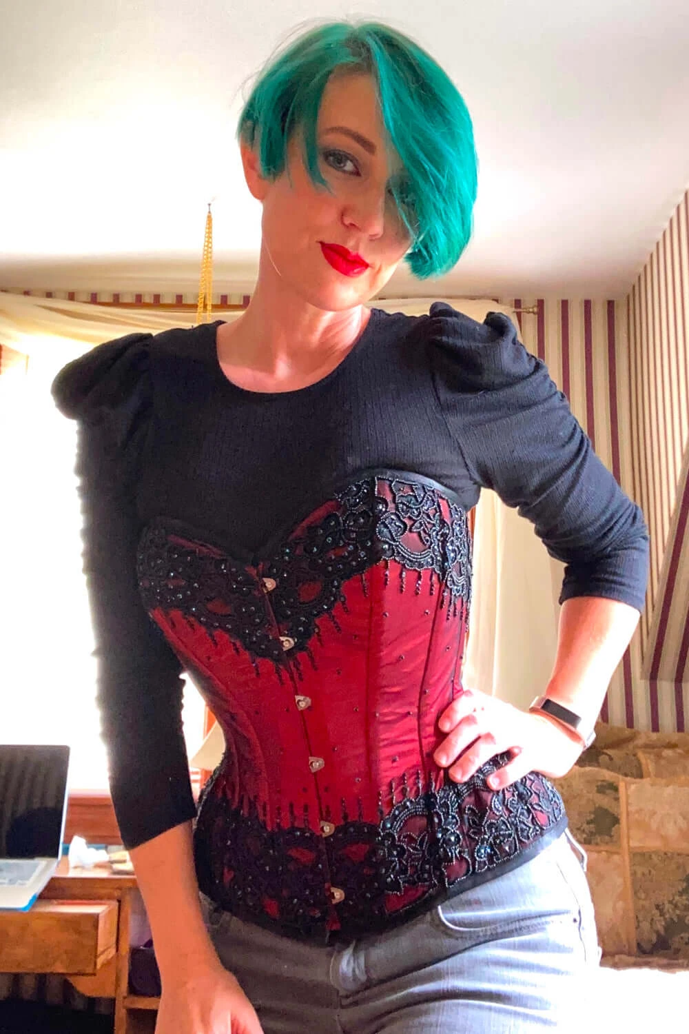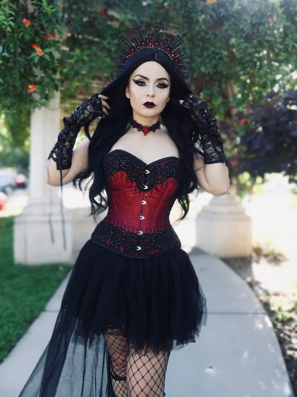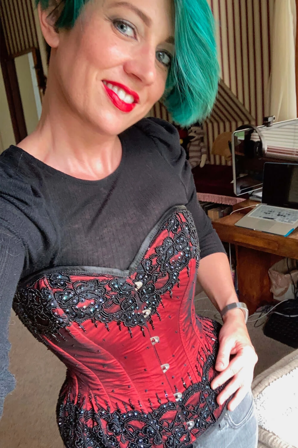 A demure and sophisticated deep red evening wear corset with beautiful black embroidery and stunning embellishments across the bust and bottom edge. This is a superb, handcrafted corset that brings something very show stopping to any occasion.