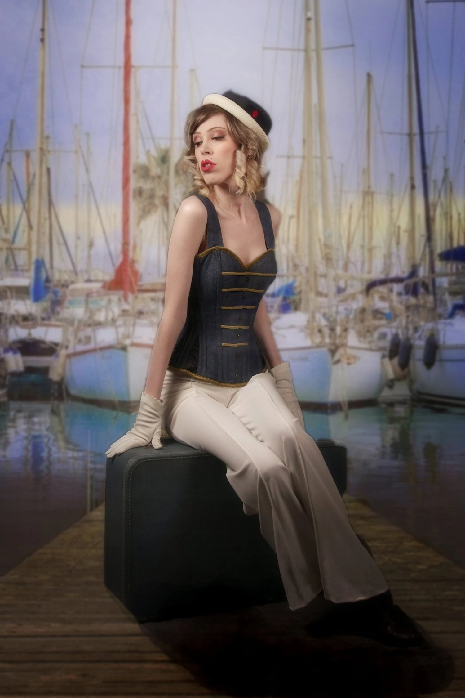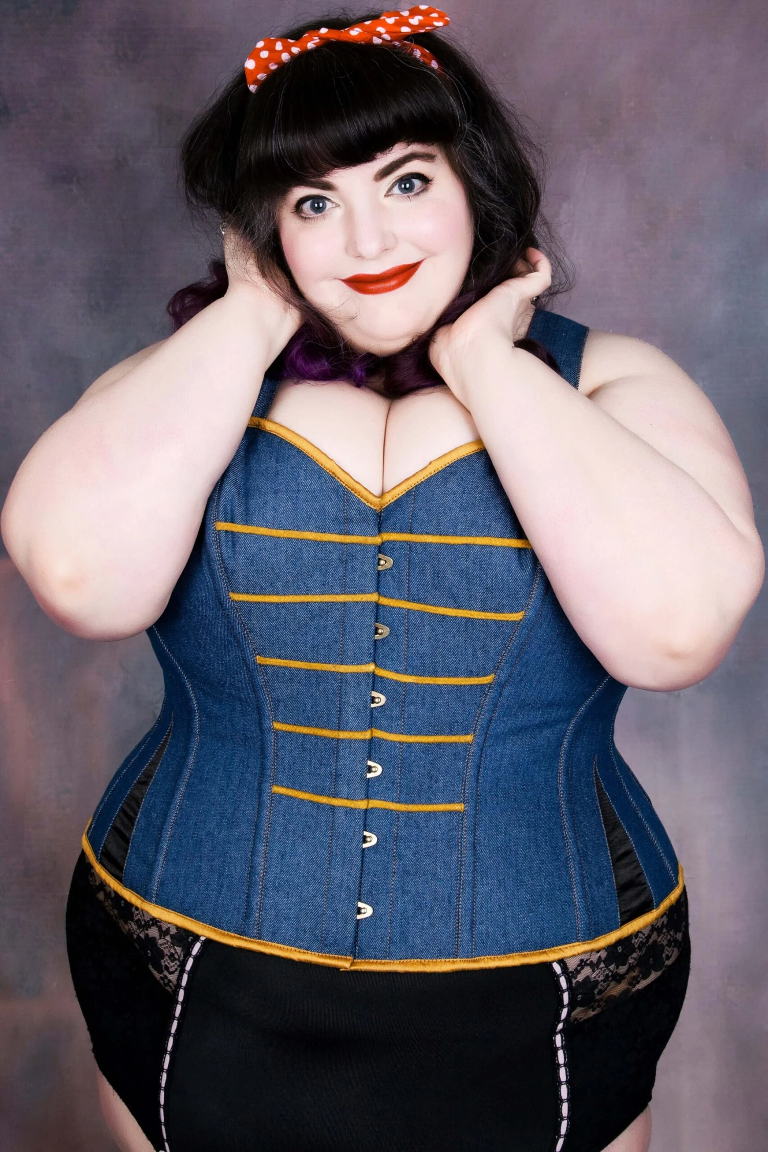 The military look never goes out of fashion and that’s why our denim military inspired corset is a customer favourite. In blue denim with horizontal gold banding and trim, this deep blue corset offers a waist reduction of up to four inches. Shoulder straps provide extra support and their ruched elastic at the back ensures that they fit any shape and size.