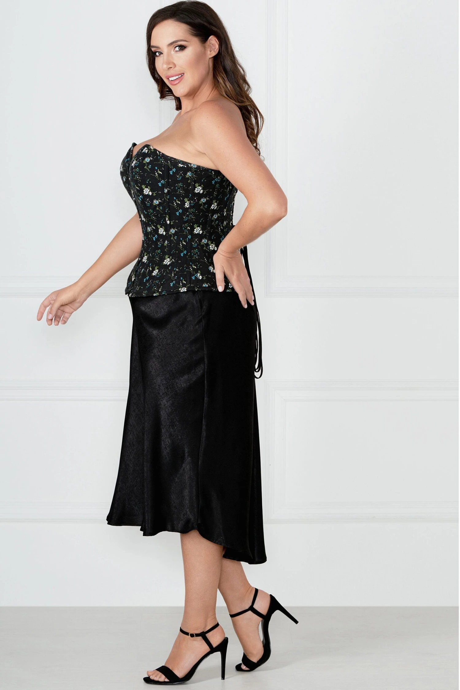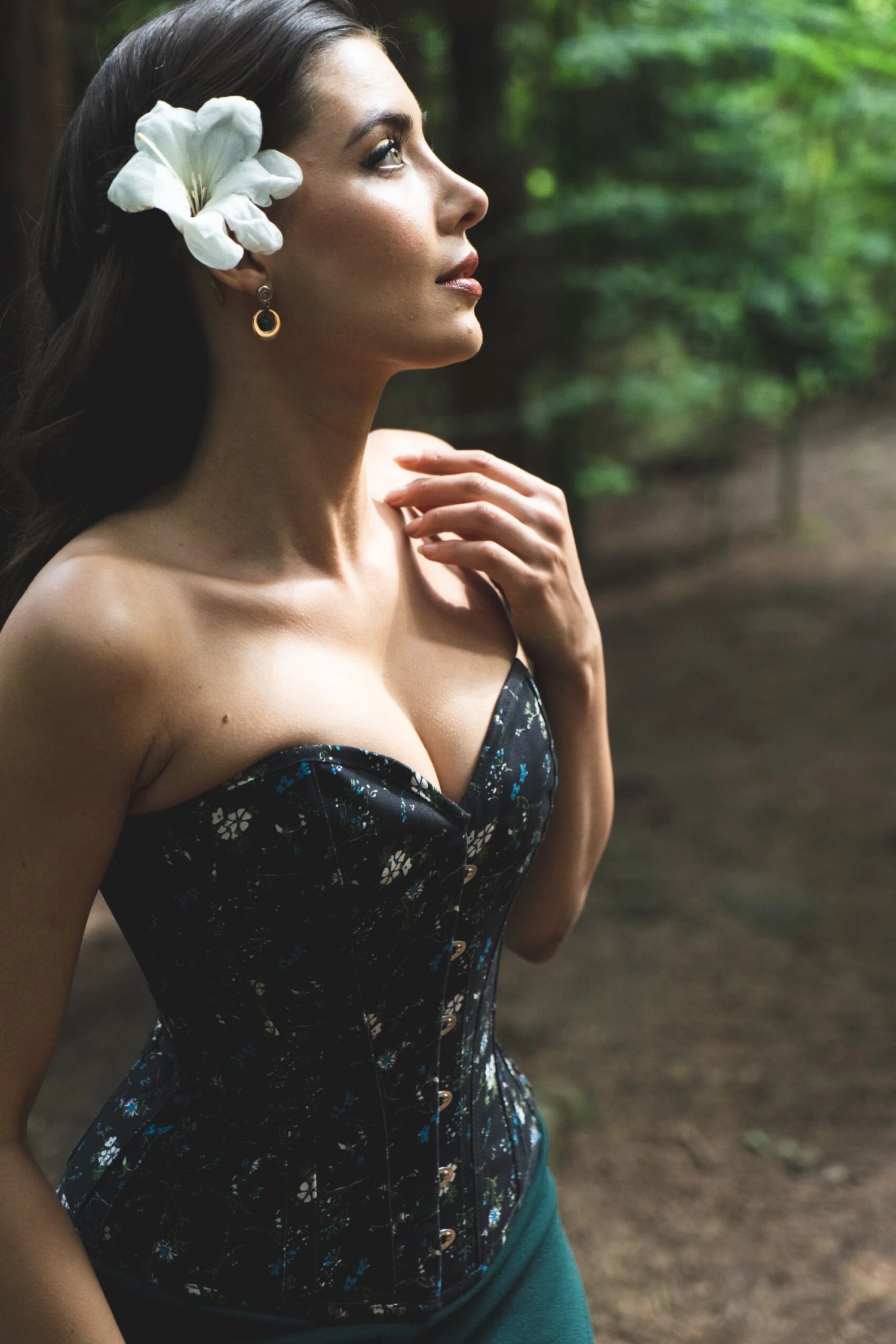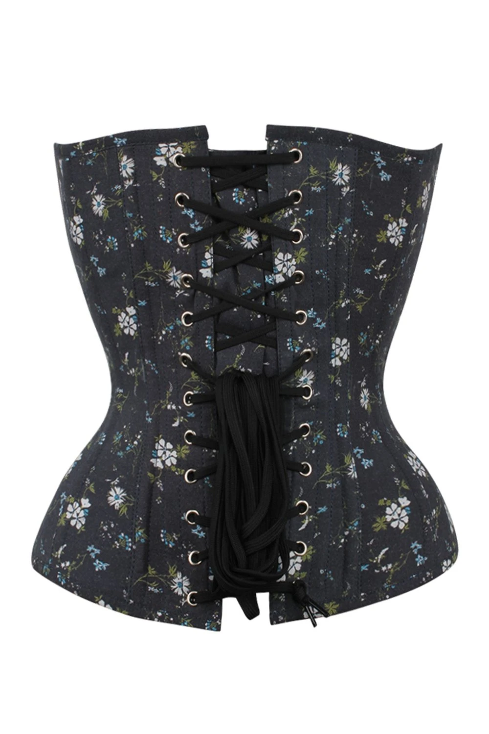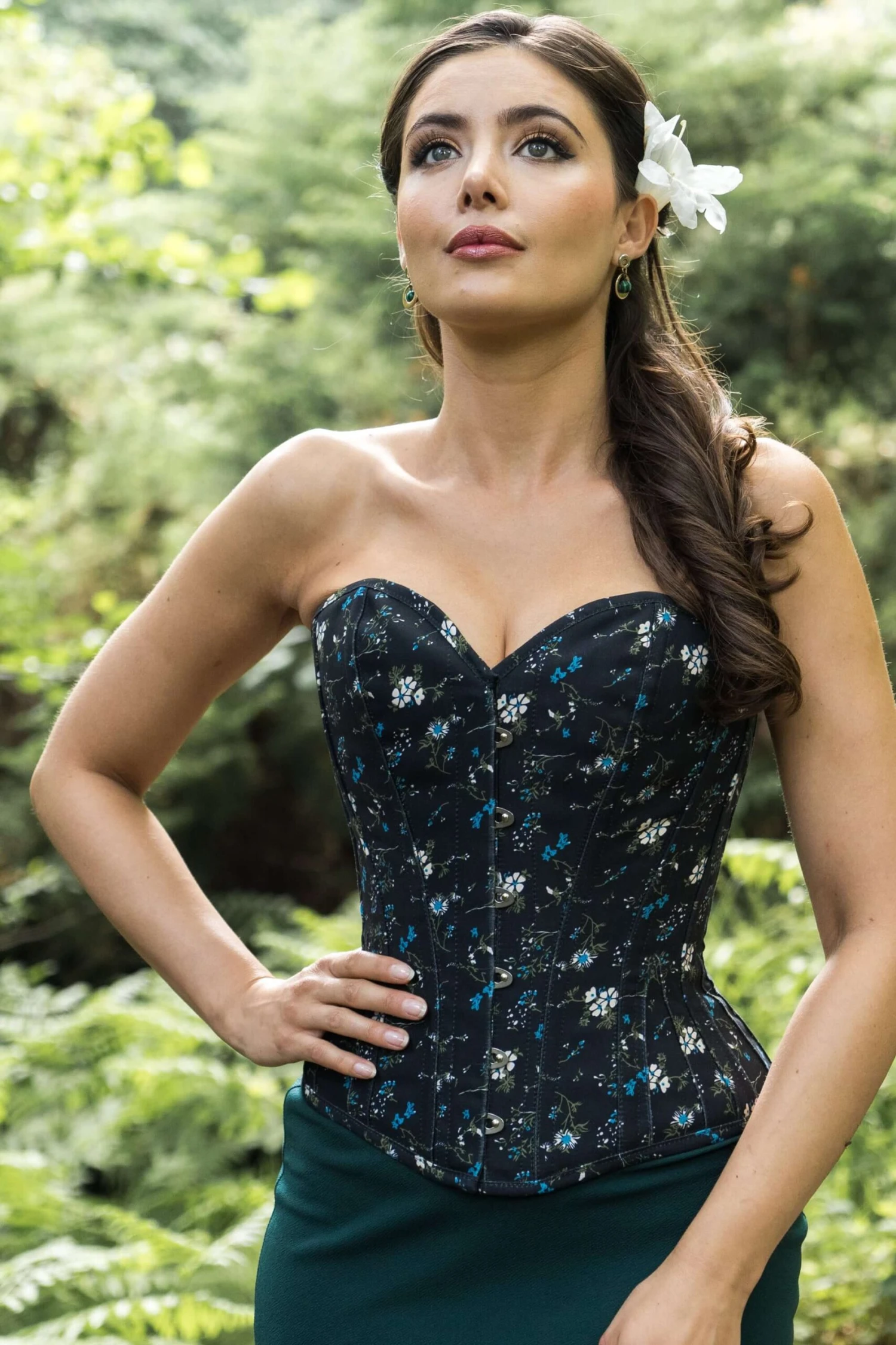 Our black ditsy print corset offers versatility and shape with a waist reduction of up to four inches. Easily paired with jeans or an evening skirt, this overbust waist tamer will take you from day to night. Made from breathable cotton and with covered boning channels, this pretty floral outerwear is sure to become a regular favourite.