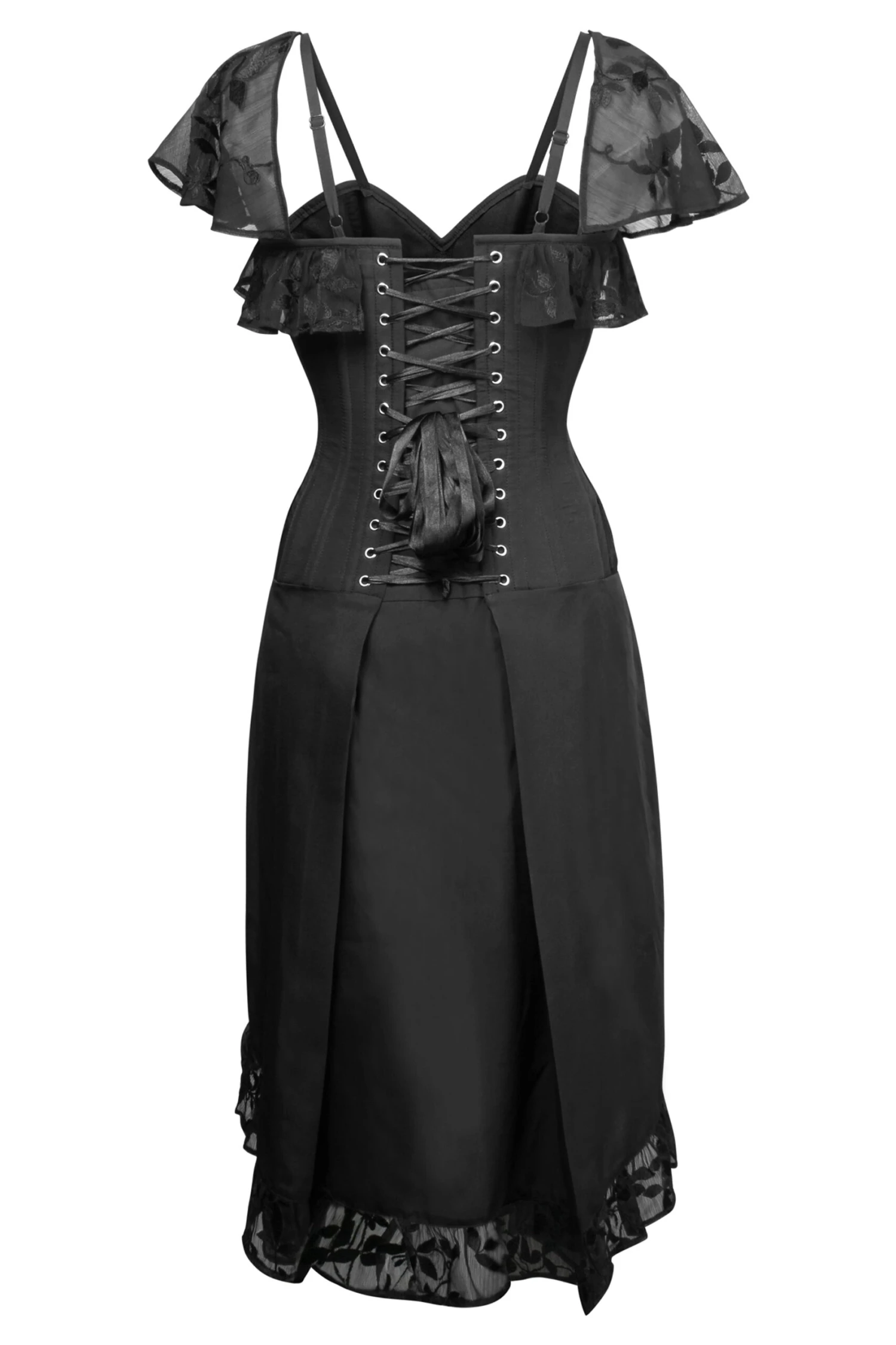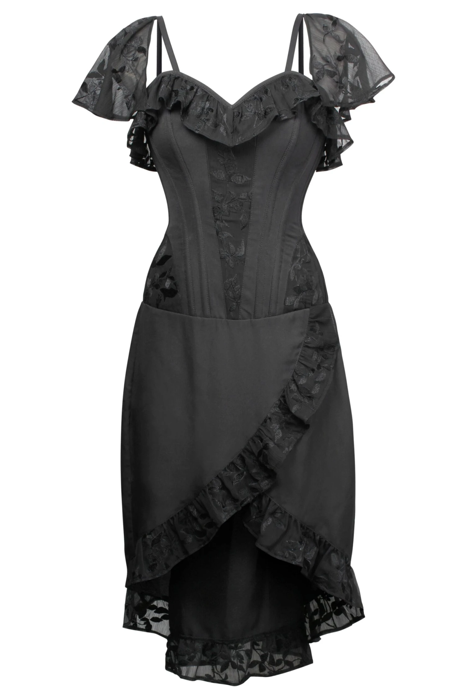Embrace the night in this truly stunning corset dress. This gorgeous dress is beautifully cut with a Gothic flair. Mini bat wing sleeves with a floral pattern float off the shoulder, and the tight black skirt lined with soft voile frill offers nothing less than the prettiest expression of femininity. This corset dress opens at the side for ease, but still has traditional corset lacing at the back to help you achieve your ideal silhouette. Adjustable straps will also help ensure that you feel comfortable and secure. Don’t be fooled by the dark, charcoal colours of this dress: it’s a show stopping number that will light up any occasion.