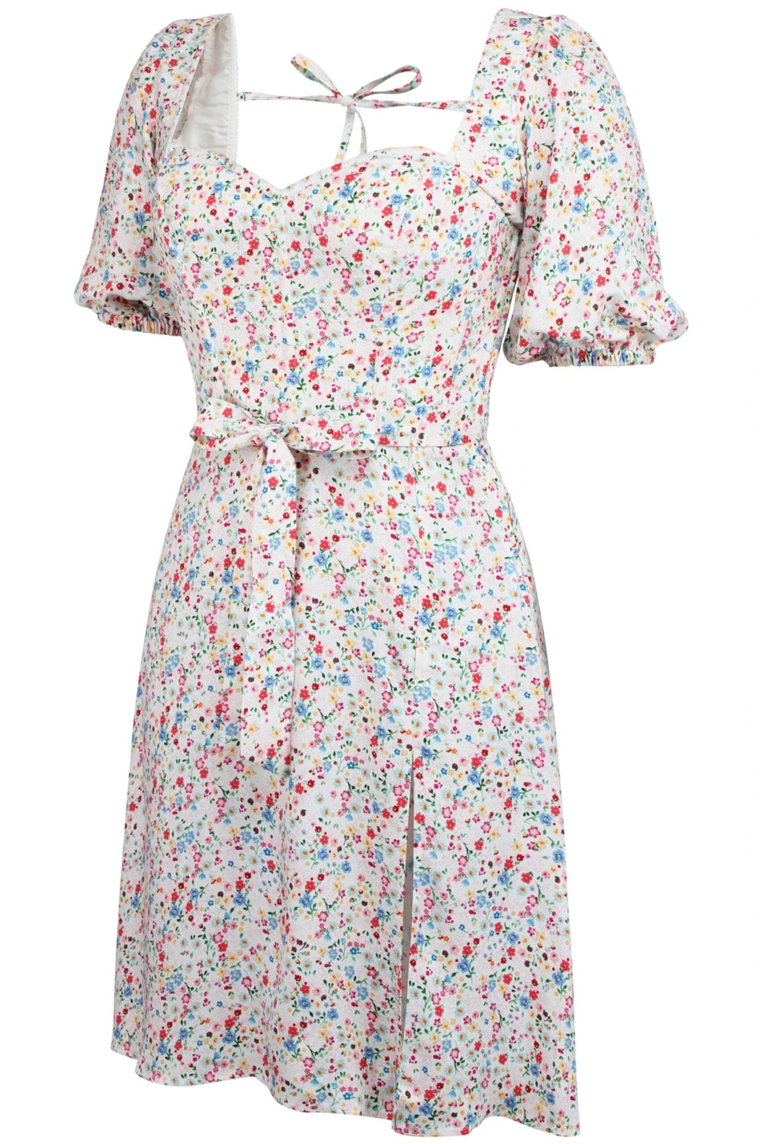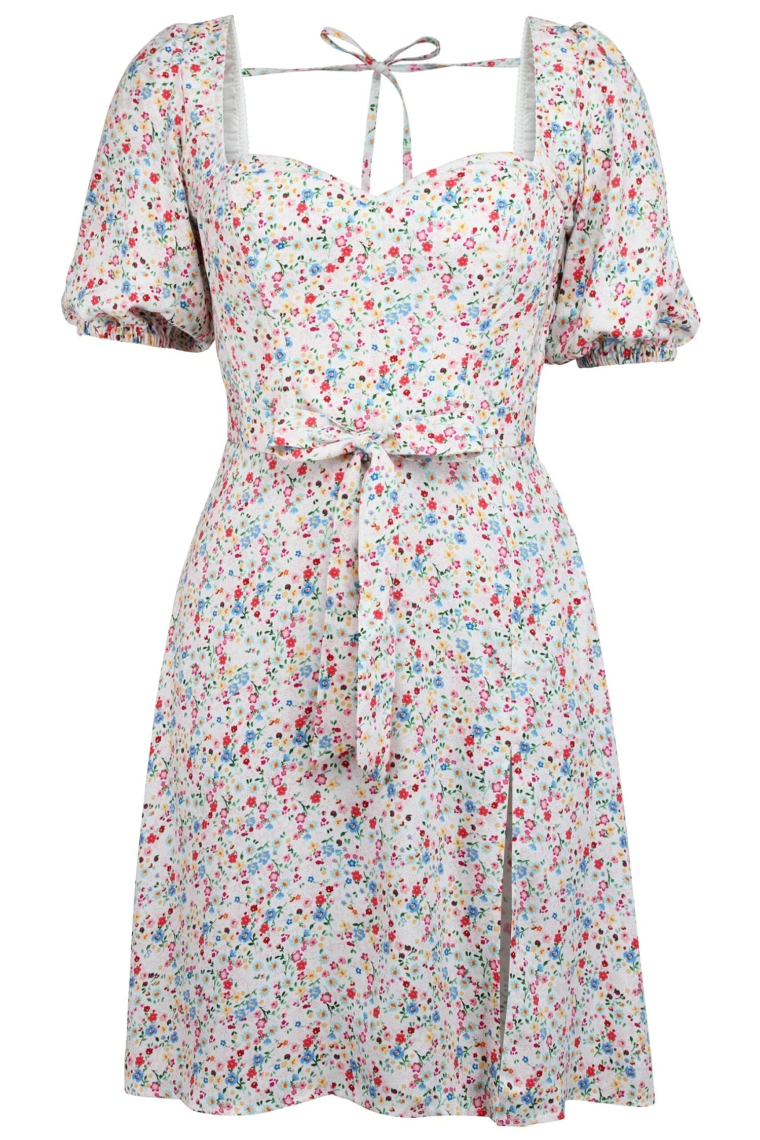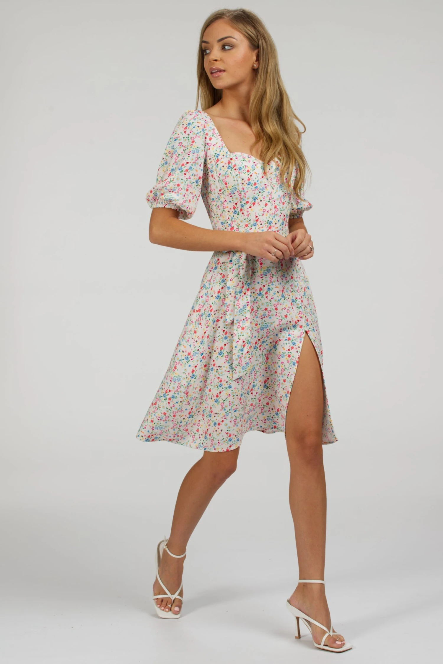 - Design Features: Elasticated Puff Sleeves, Tie Front Belt, Side Split, Side Zip
