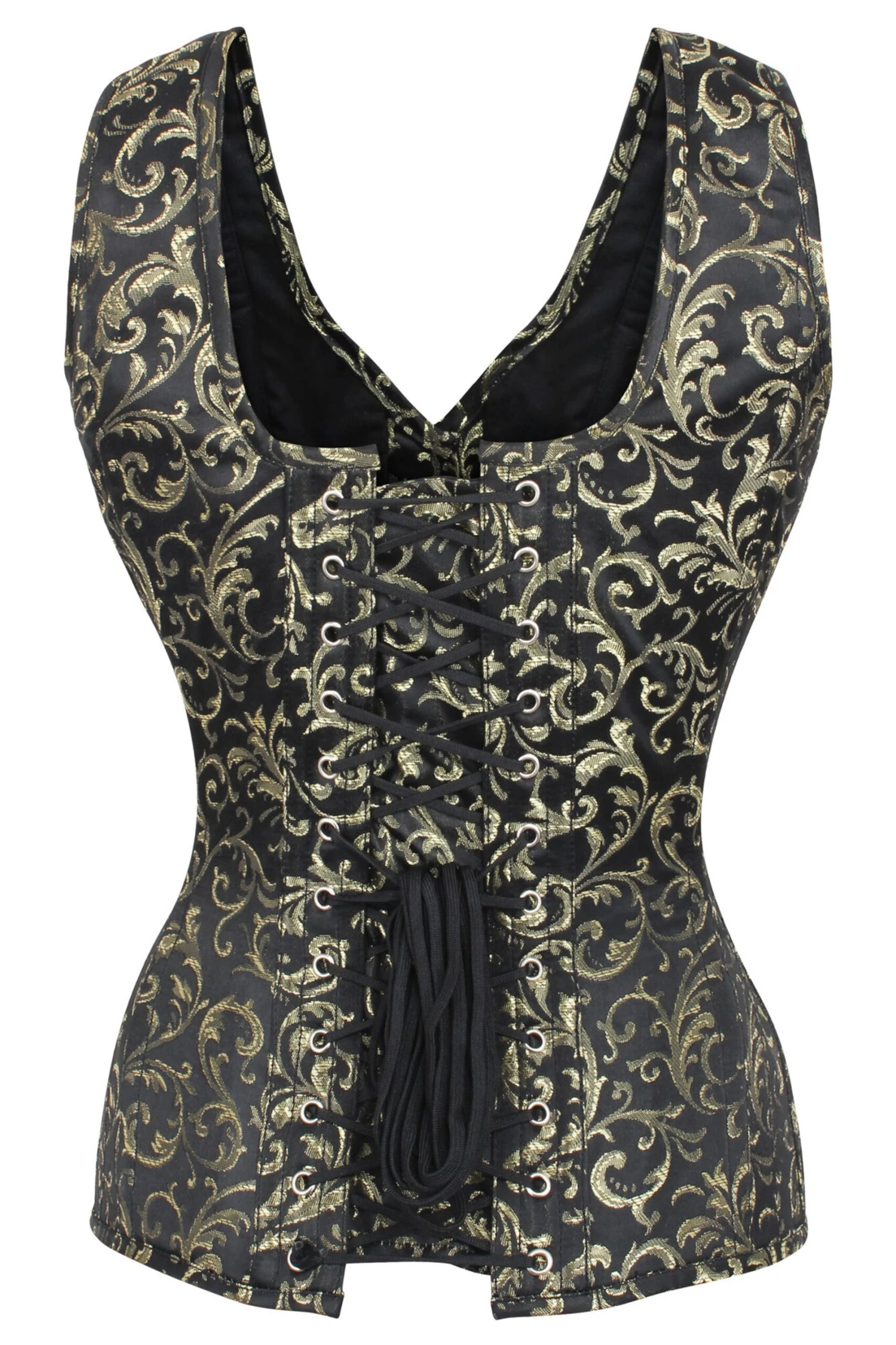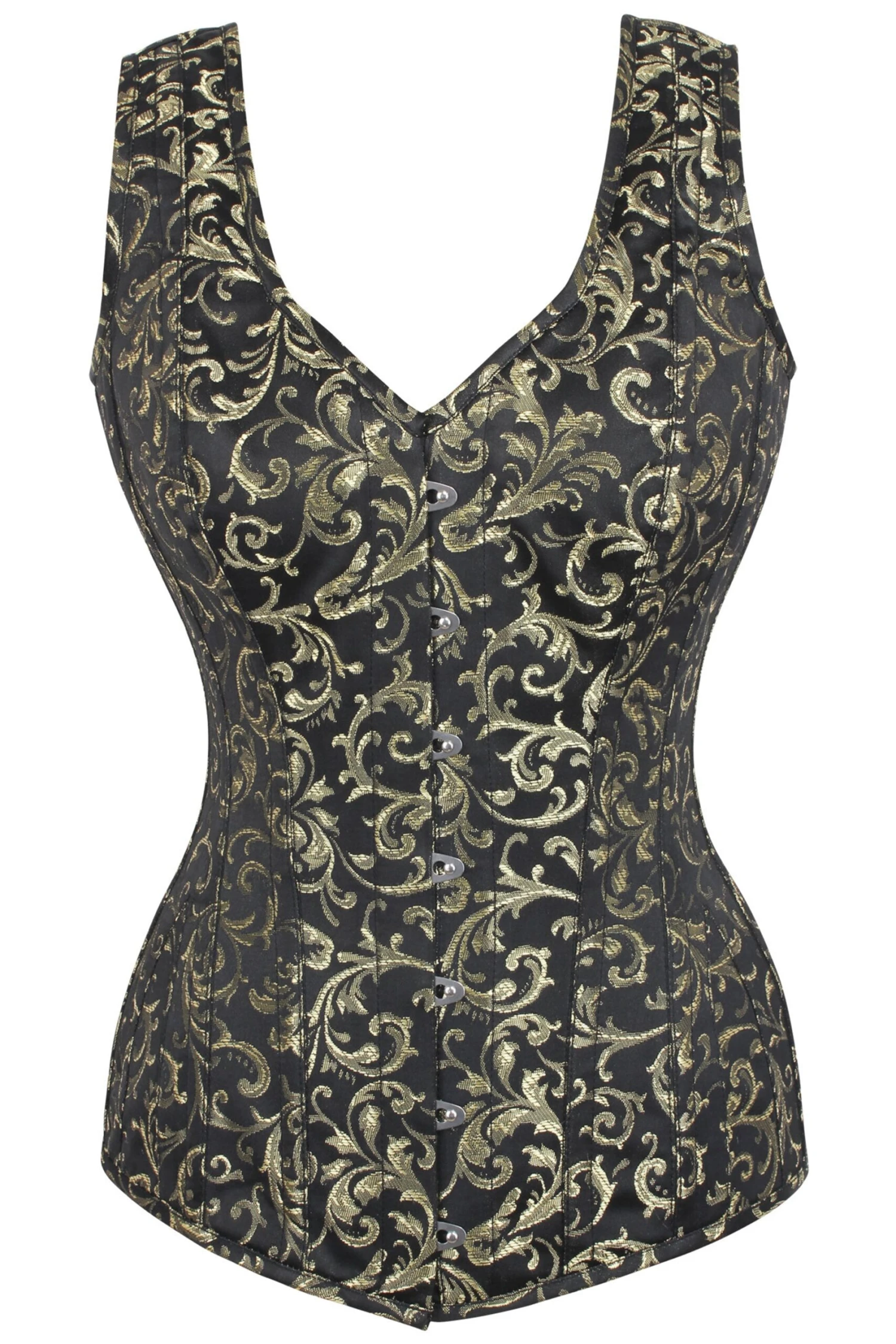 A stunningly simple design in gold brocade, this v-necked Waist Taming corset can be worn in a variety of different ways. With internal spiral steel bones, this corset can cinch your waist to the tune of 3-4 inches which will give you a stunning hourglass figure with the minimum of effort. The shoulder straps offer extra support and the cotton lining allows everyday wear for those embarking on a waist training routine. Equally effective as a casual or formal piece, this gold overbust corset is one of the new designs in our mid-strength Waist Taming range.