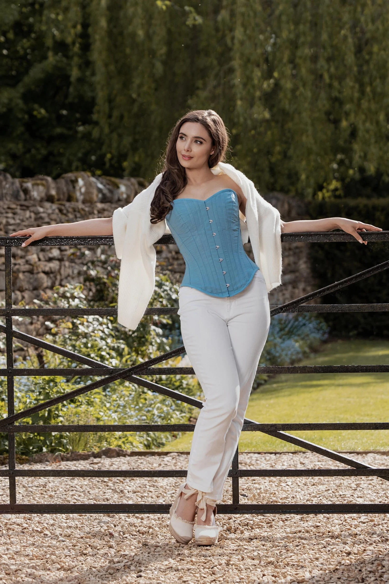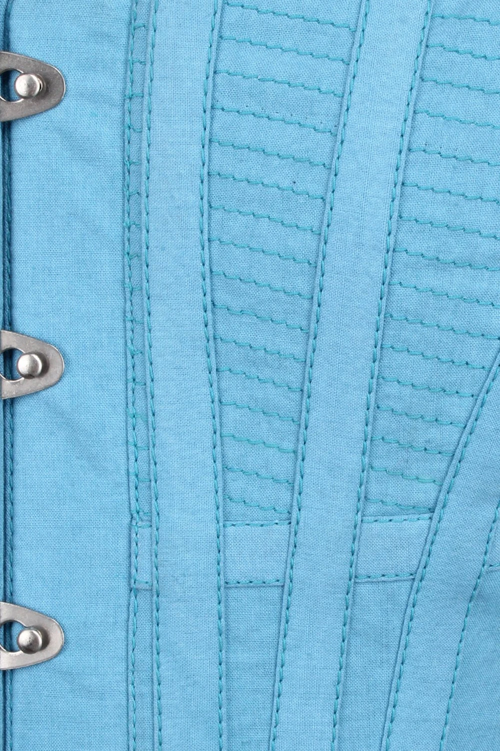 This curve-enhancing corset flaunts historical accents while echoing the sensuality seen in contemporary lingerie. A sweetheart neckline, exposed front fastenings, a cinched frame and a shaped hem create a reminiscent mood with a beautiful, boudoir feel. Based on a pattern from the 1800’s, it can reduce the waist size by up to 4 inches, so it’s easy to draw parallels between its alluring effect and its period past. Crafted in bright blue cotton, it updates these recognisable signatures with an injection of punchy colour.