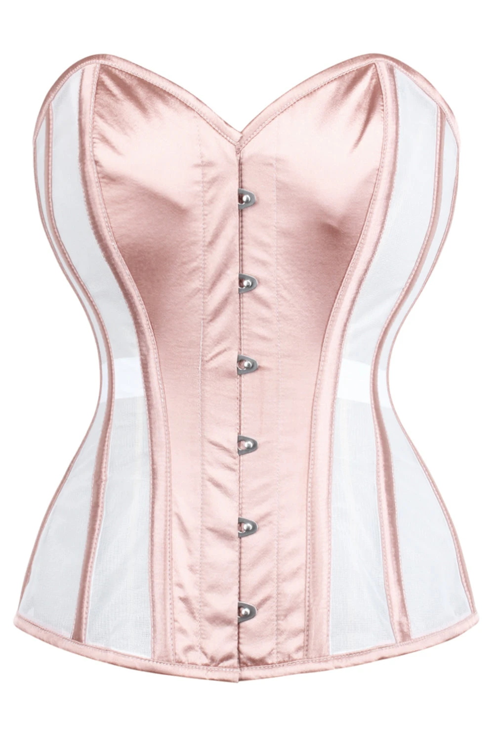 Our satin and mesh overbust corset makes the perfect choice for discreet waist reduction under your clothes. The sheer mesh panels let skin breathe whilst camouflaging your shapewear. The powder pink satin makes this a popular choice with those who like a deeply feminine look, whilst offering a waist reduction of up to four inches. The integral steel bones are covered in fabric, combining strong control with comfort and a sleek silhouette, whatever your cupsize.