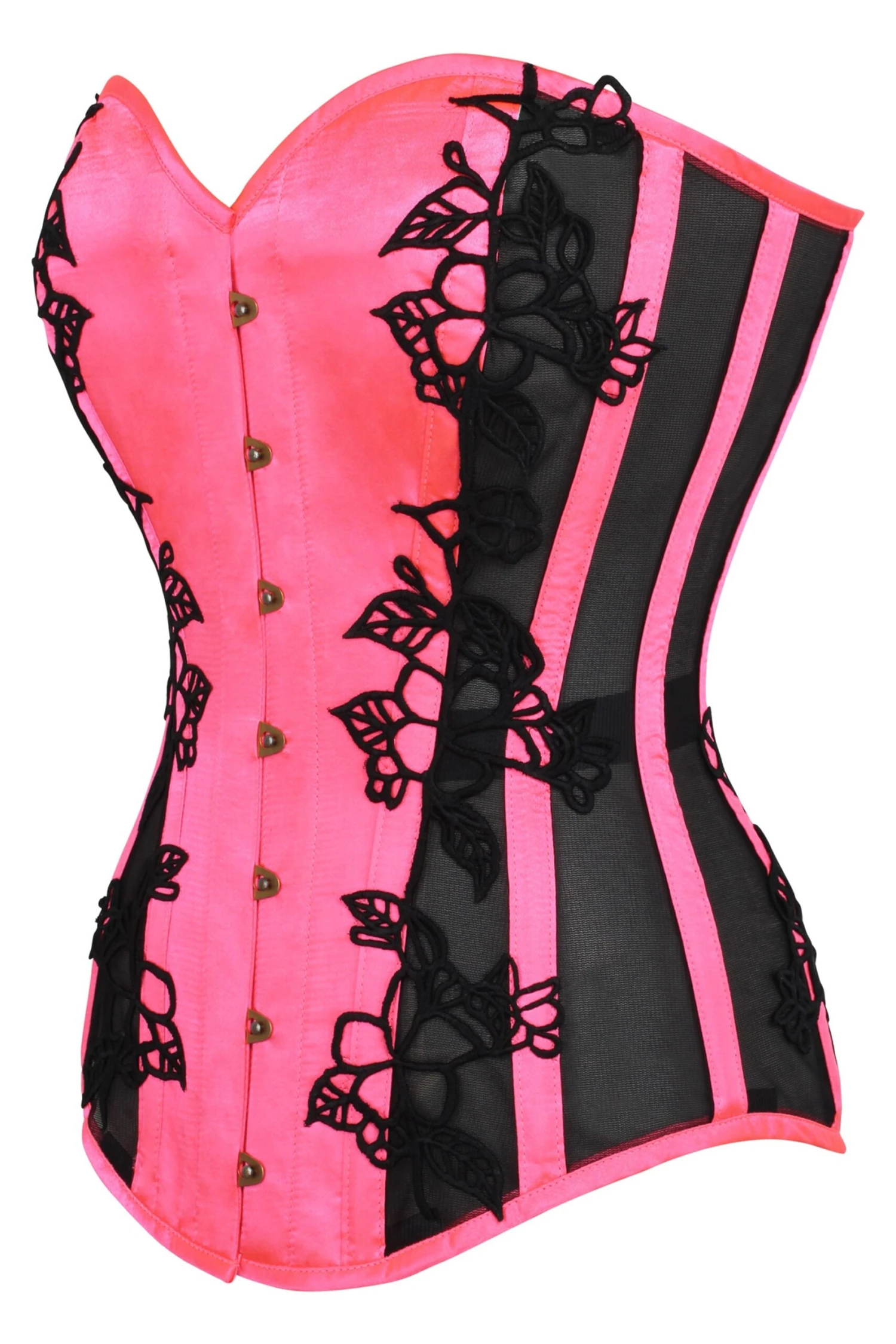 Our sweetheart neckline overbust corset in hot pink can be worn as underwear or daring outerwear, adding an edgy and romantic look to your night. Offering a waist reduction of up to three to four inches, this lightweight corset has stunning attention to detail. With embroidered lace overlay and alternate panels of mesh and satin, this corset is pure glamour, with a flattering silhouette.