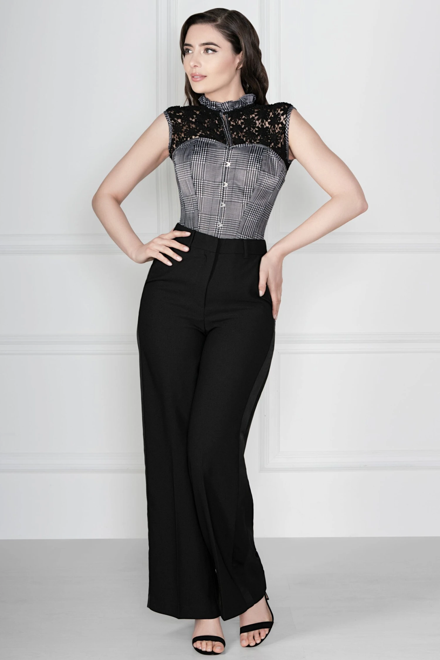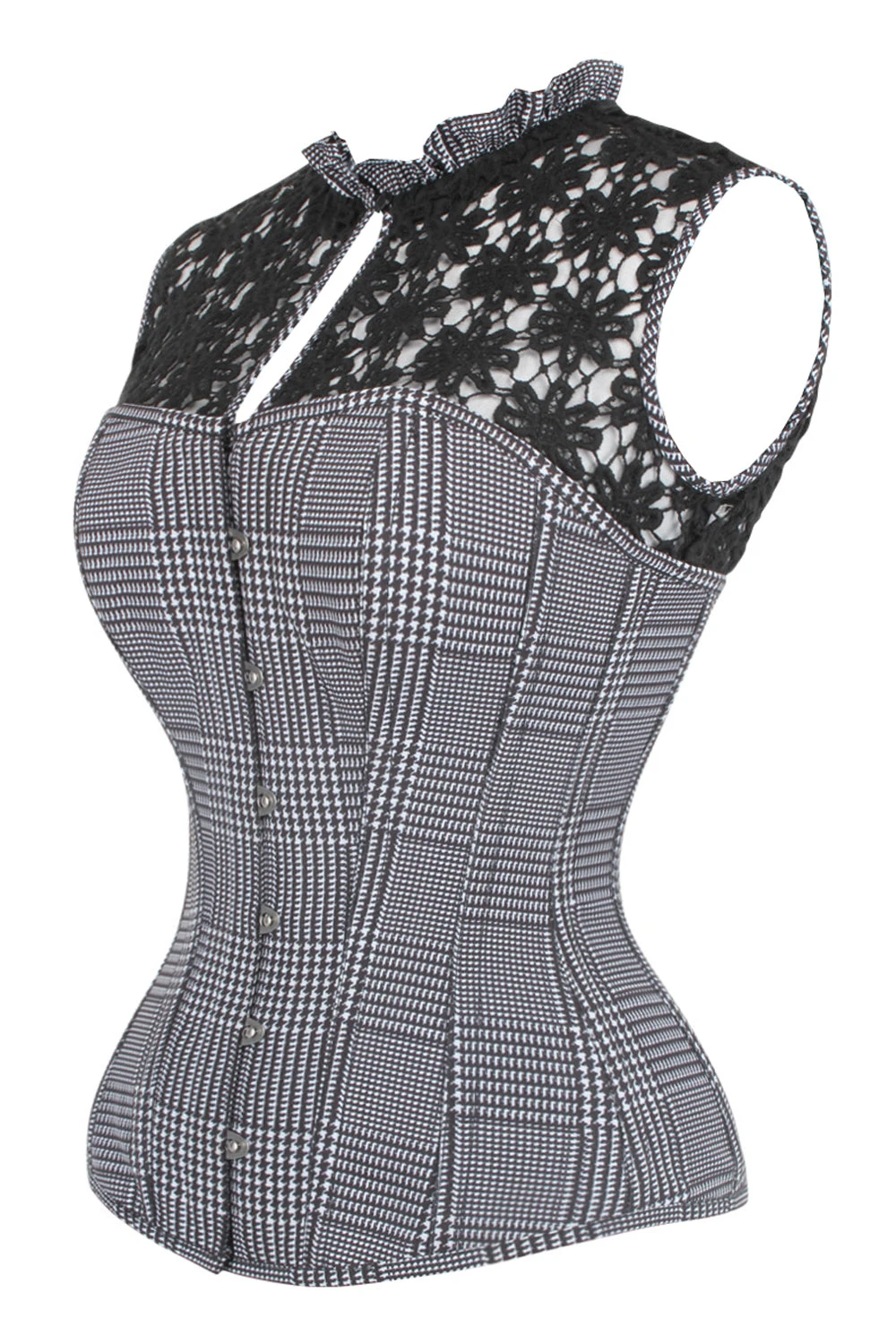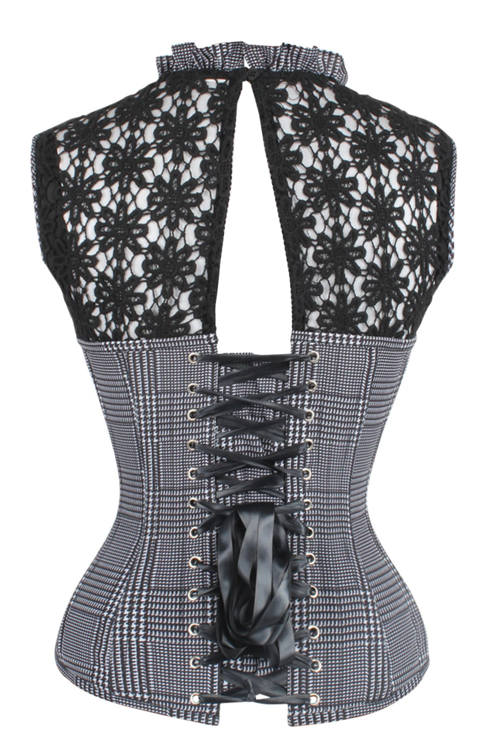 - Corset Design Features: Guipure Lace Sleeveless Top, Button Keyhole Front and Back, Frill Neck-edge, Check Print