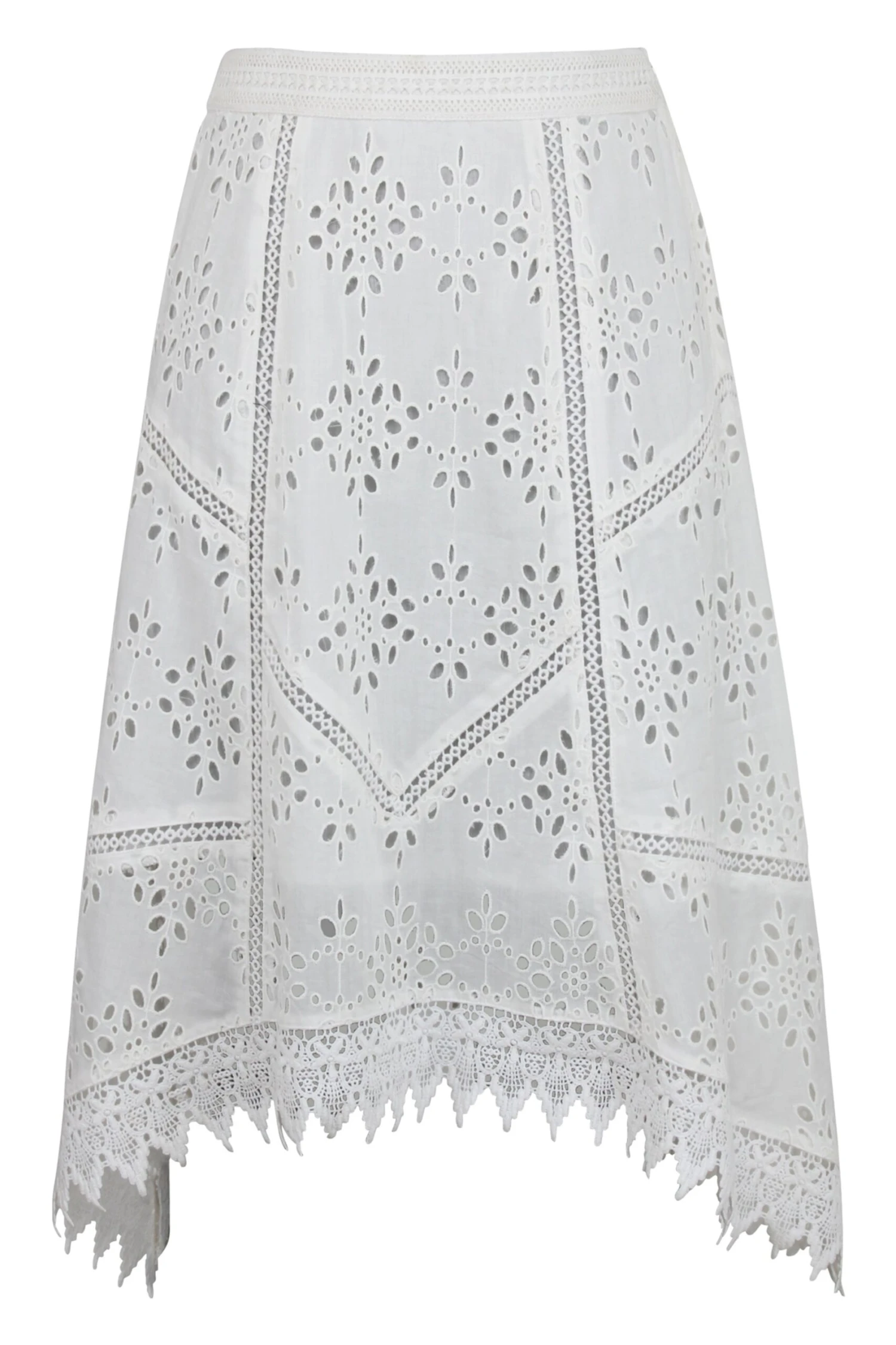 Our Jasmine broderie anglaise skirt is constructed with three different lace trims and a complementary schiffli base fabric. The slim fit at the waist flares to a beautiful handkerchief bottom, which creates a stunning hourglass silhouette. Wear with our other broderie anglaise corset tops such as Daphne, Alyssum and Delia.