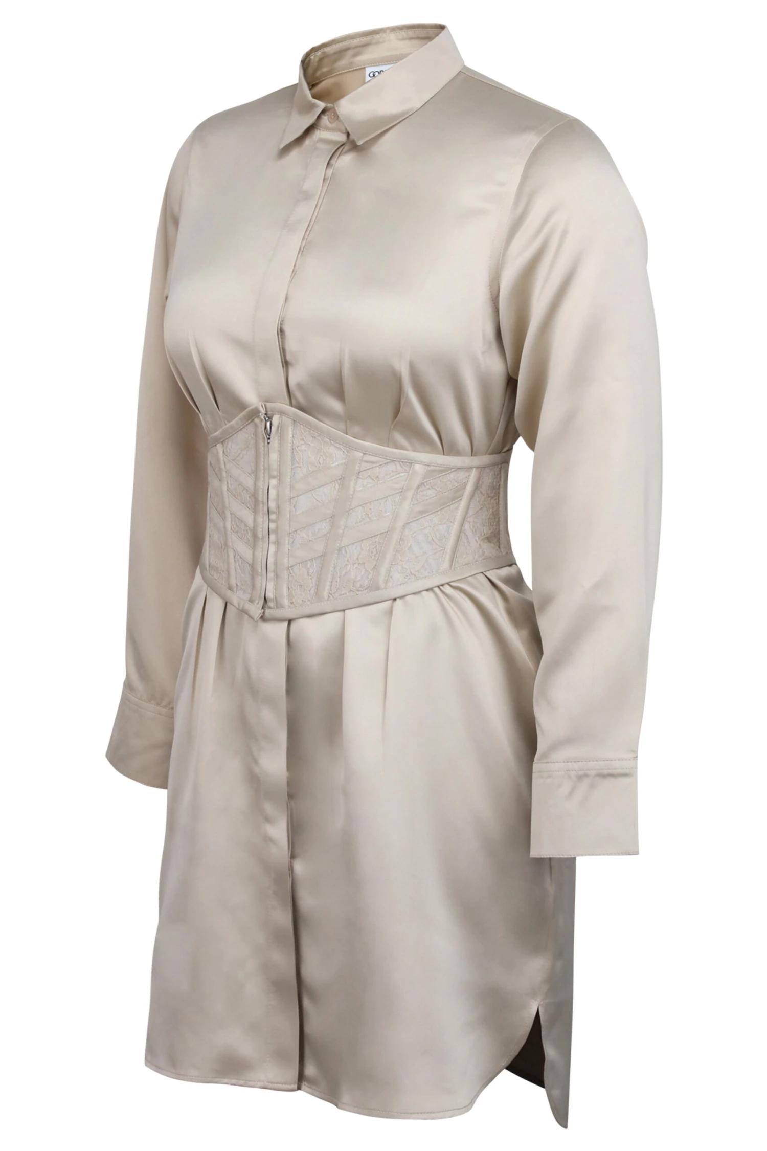 Looking for an elegant, simple to wear, fan laced waspie? We have got you covered. This opulent Champagne and Whisper White tonal waspie is calling out to your wardrobe. The non-adjustable fan lacing adds true classic corset detailing, whilst the zip front allows the corset to be easily slipped on. Zip over our complementary satin shirt dress, Matilda, add a pair of heels and show off that cinched waist.
