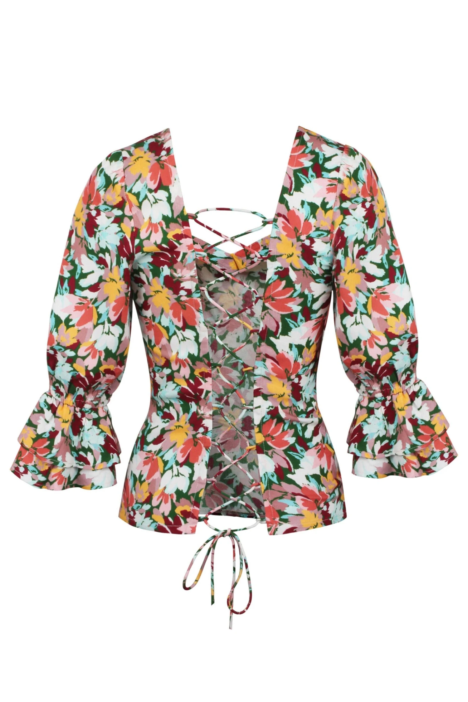 - Design Features: Sweetheart Neckline, Frill Cuff Sleeve, Back Self Lacing with Loops