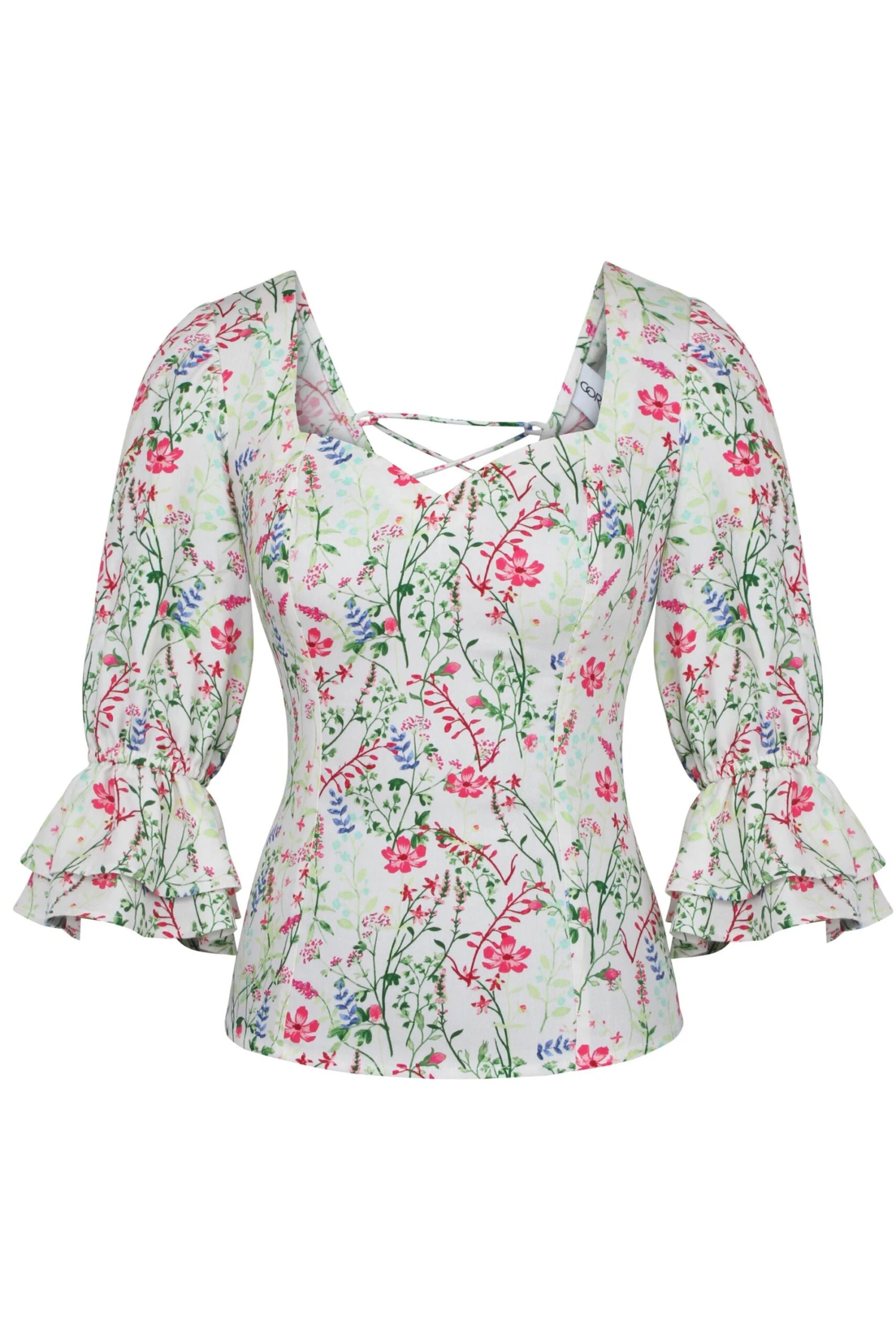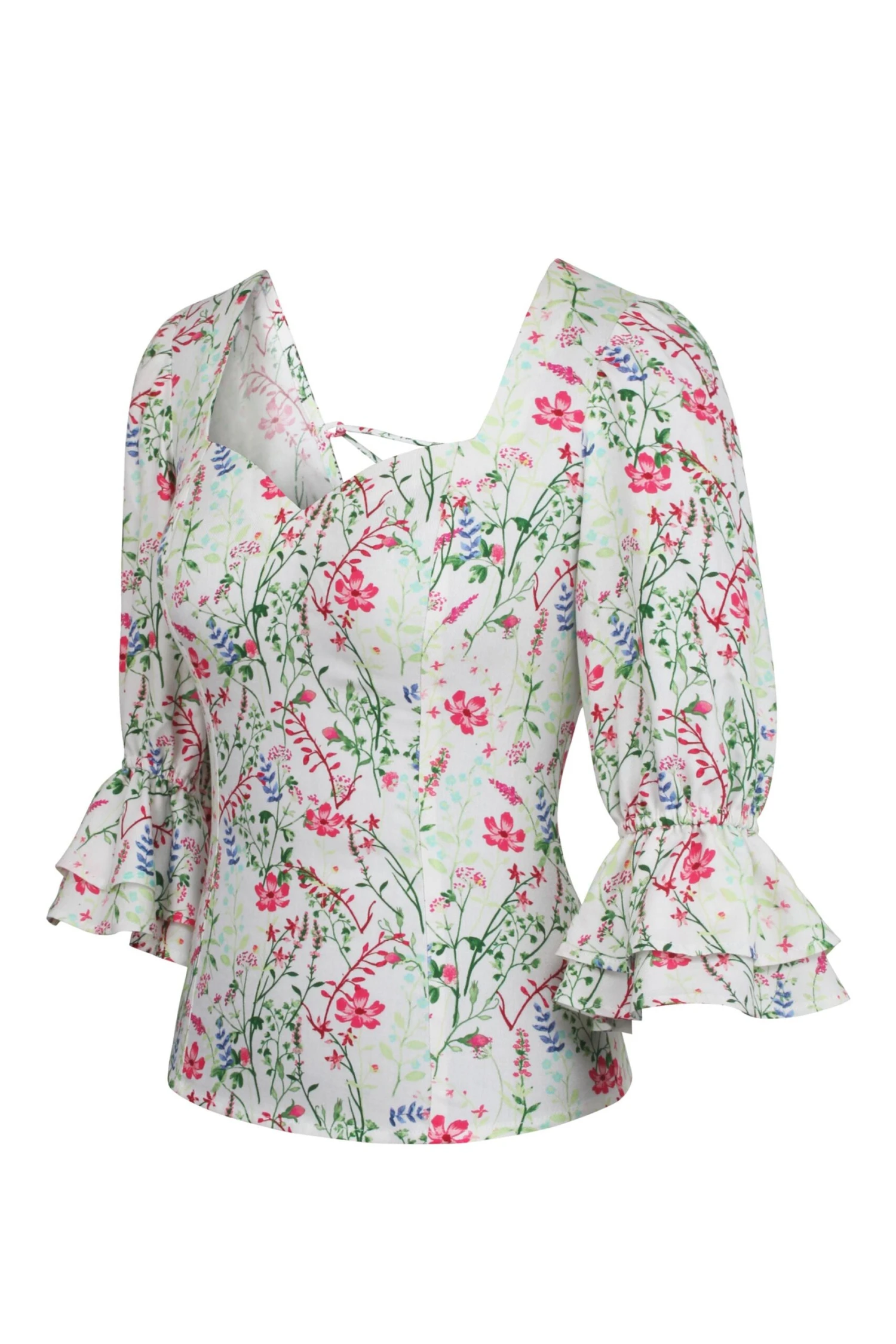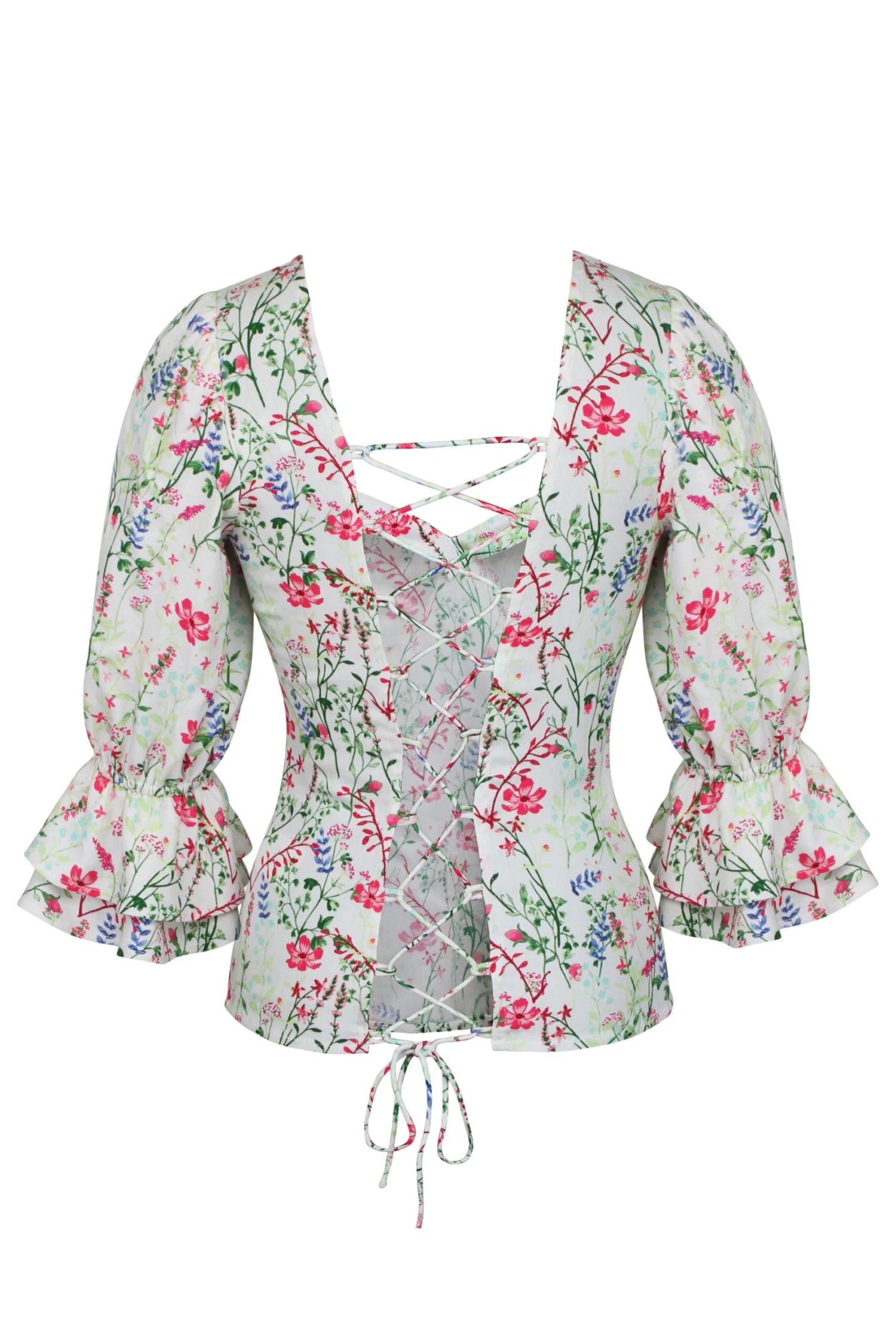 - Design Features: Sweetheart Neckline, Frill Cuff Sleeve, Back Self Lacing with Loops