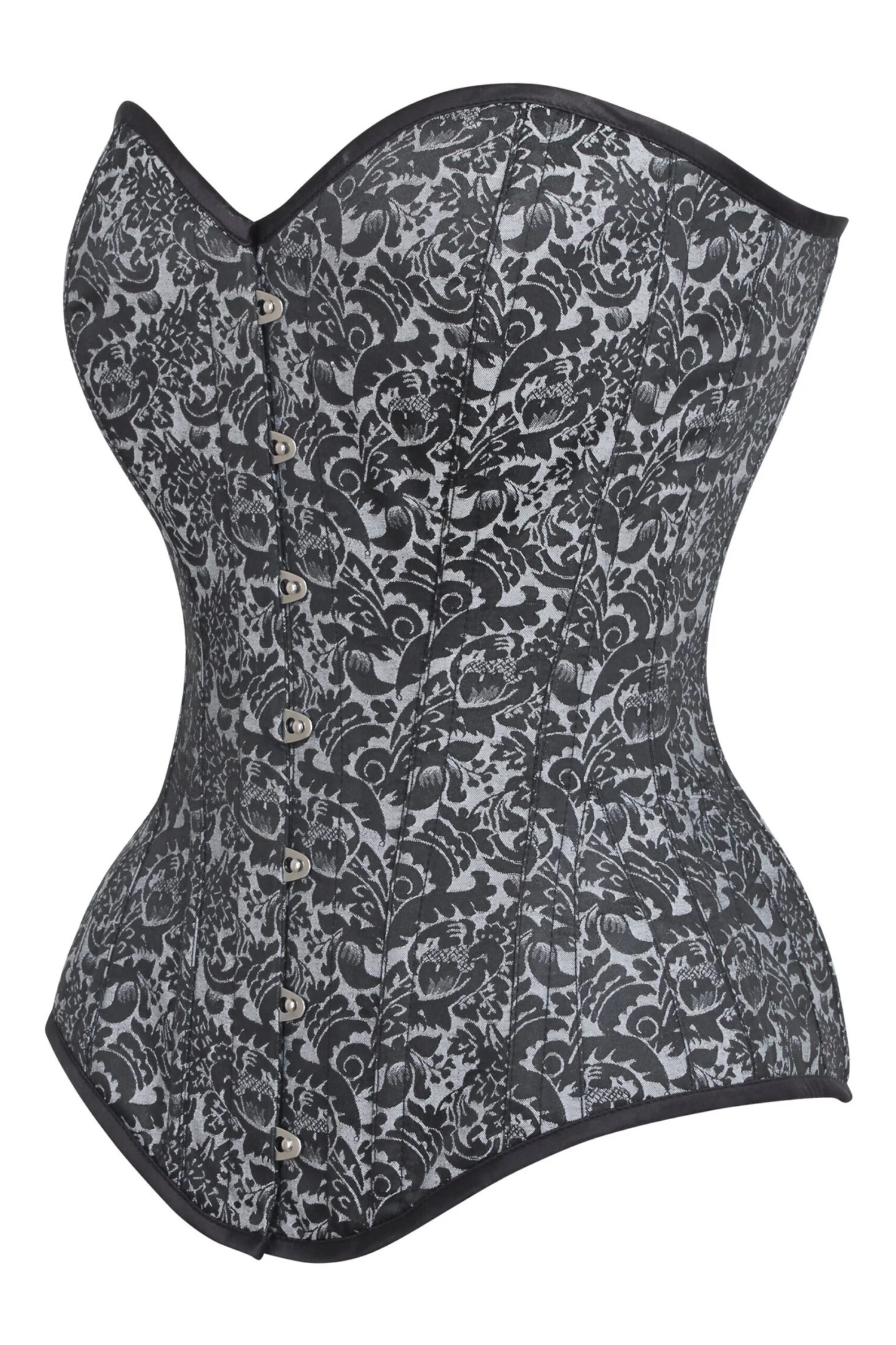 A long, silver sophisticated Waist Taming corset with strong spiral steel boning and perfect for taller ladies. For a great formal wear look try wearing this item with a long skirt. Featuring a beautiful sweetheart neckline and hip gores to enhance those curves to further accentuate your reduced waistline and for a better fit. Open the corset to the fullest before putting on and you will experience an amazing 3-4″ waist reduction when tightened fully.