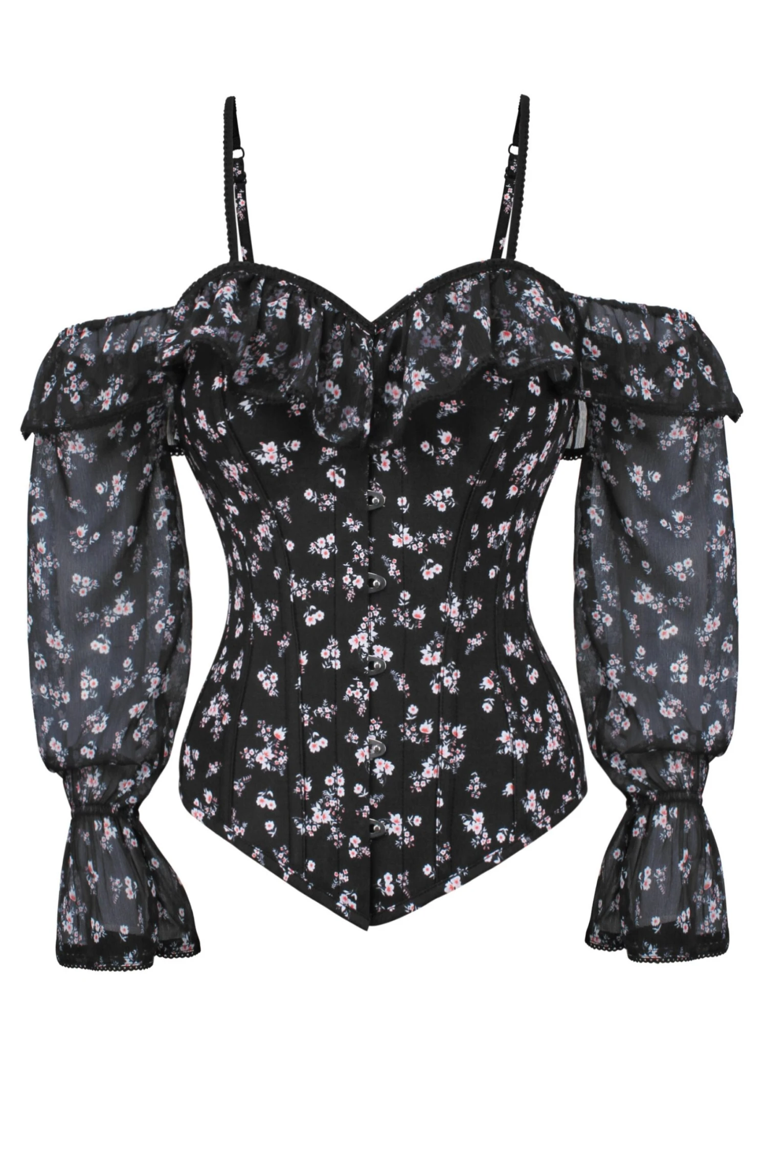 - Corset Design Features: Floral Print, Chiffon Off the Shoulder Sleeves, Adjustable Strap, Front Frill