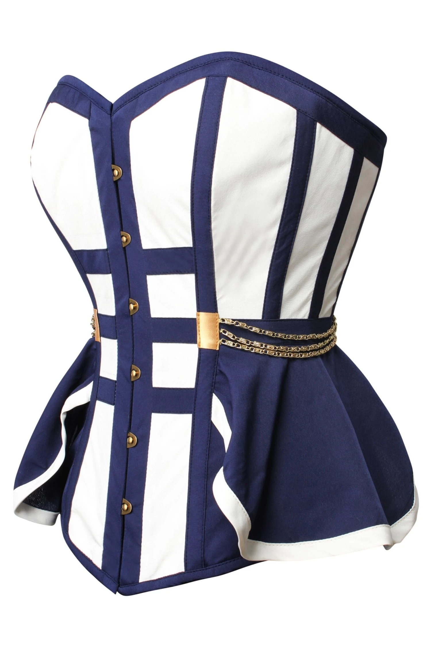 This one’s for all our nautical babes out there! What military-style collection would be complete without a nod to the navy? Making use of the classic naval colours of navy, white and gold, this overbust corset adds a touch of extra glam with gold chains attached at the side and gold clasps at the front. A peplum frill accented with navy-coloured crepe will accentuate your hips, as our Waist Taming corset brings in your waist to help give you a stunning silhouette with ease. This lightweight corset is perfect for the warmer months, both beautiful and functional. A real showstopper.