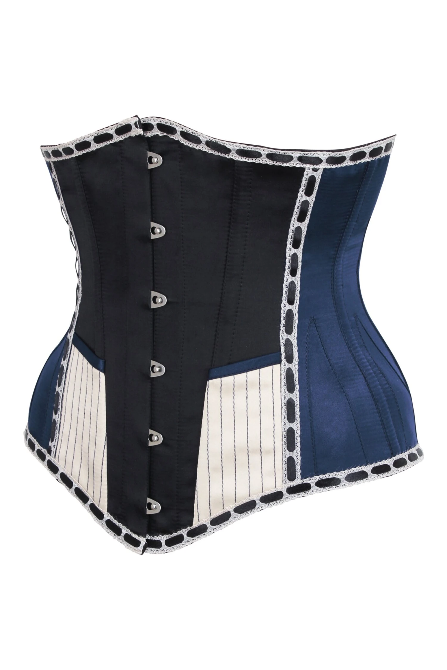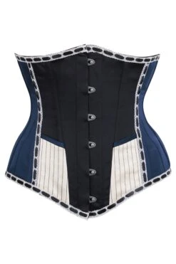 Stunning, quirky statement piece taking inspiration from the Victorian Circus and military. Brand new edition to our Steampunk Waist Taming range which is steel boned and can reduce the waist up to 4 inches. This is a longline underbust with hip gores for a sensational shape. The front panels are black with a champagne colour slanted pocket, navy blue binding and pinstripe stitched detail. There is pretty lace with black ribbon woven through at the top and bottom edge which really adds to the historical feel of this design. The main body is in a beautiful rich navy blue matt satin which will turn heads.