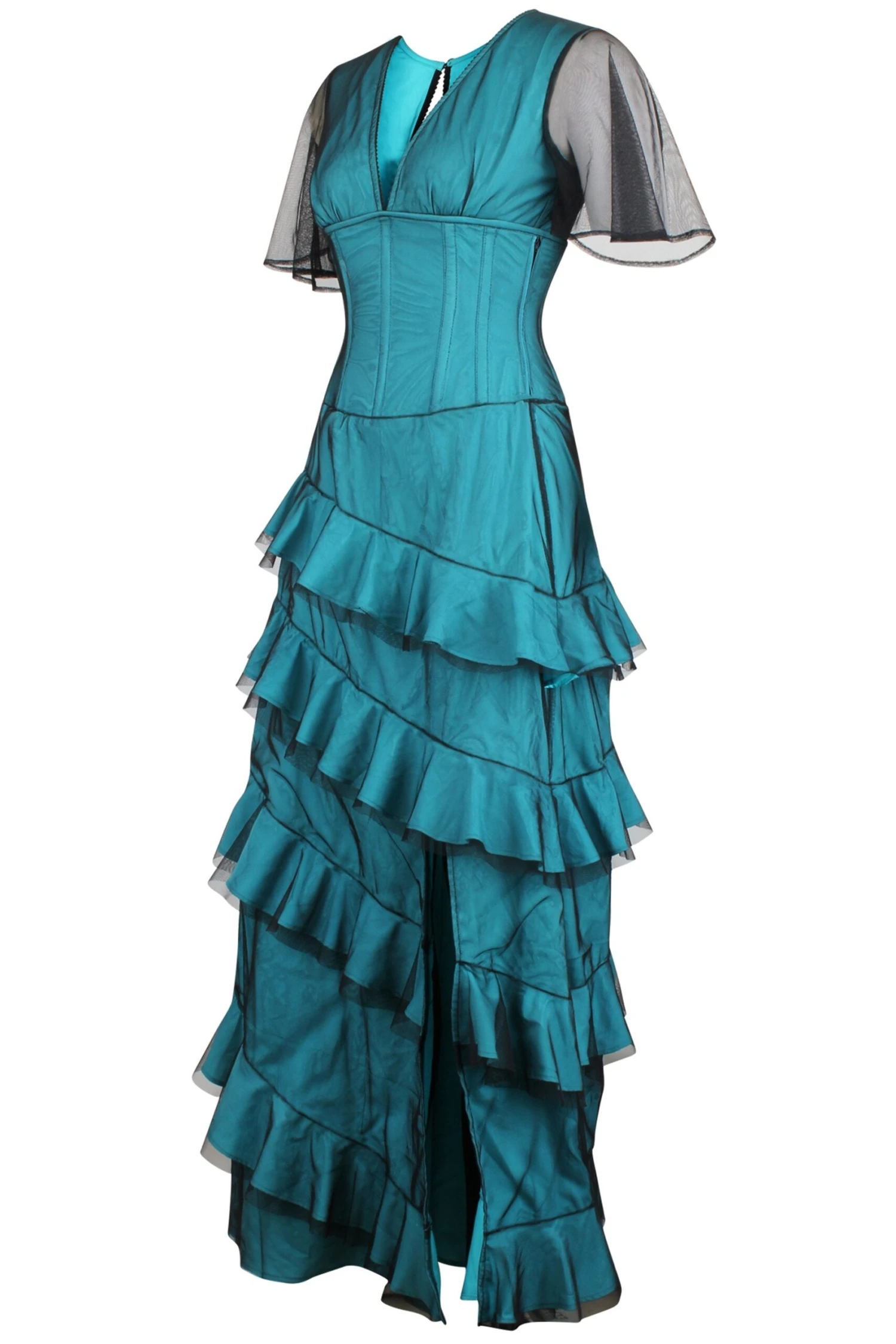 Our elegant turquoise corset dress provides a flattering waist reduction of up to four inches. With a keyhole neckline and draped chiffon sleeves in black, this is the perfect dress to cover shoulders and upper arms whislt still getting a streamlined silhouette. Wear the bra of your choice with this underbust corset – all straps will be covered. The multi tiered skirt and lightweight fabric makes this perfect for dancing.