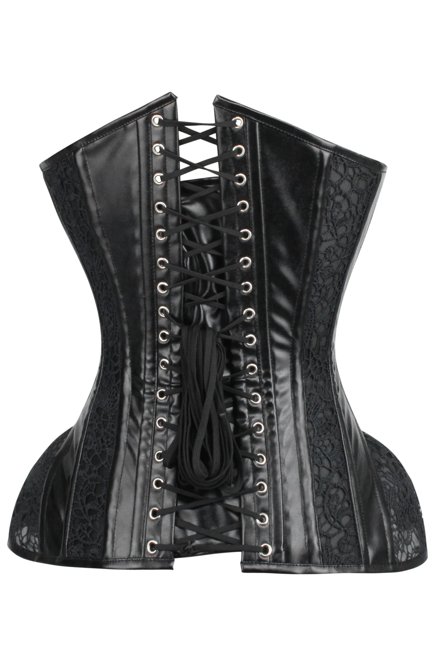 This corset is an intricately made piece of lingerie with elaborate detailing. Featuring panels of sheer mesh with black lace overlay, your new black PVC corset is a heady mix of the sleek and the sensual. This V neck waist tamer will reduce your waist measurement by up to four inches, giving you that extra va-va-voom. With matte stitching and a traditional lace up back, the corset has all details covered and is sure to turn heads.