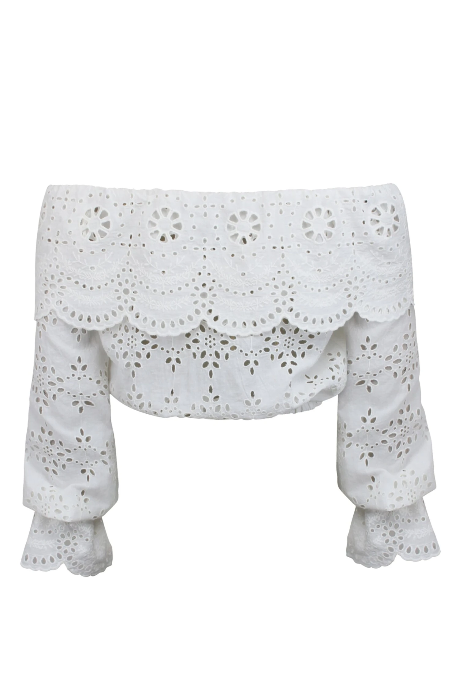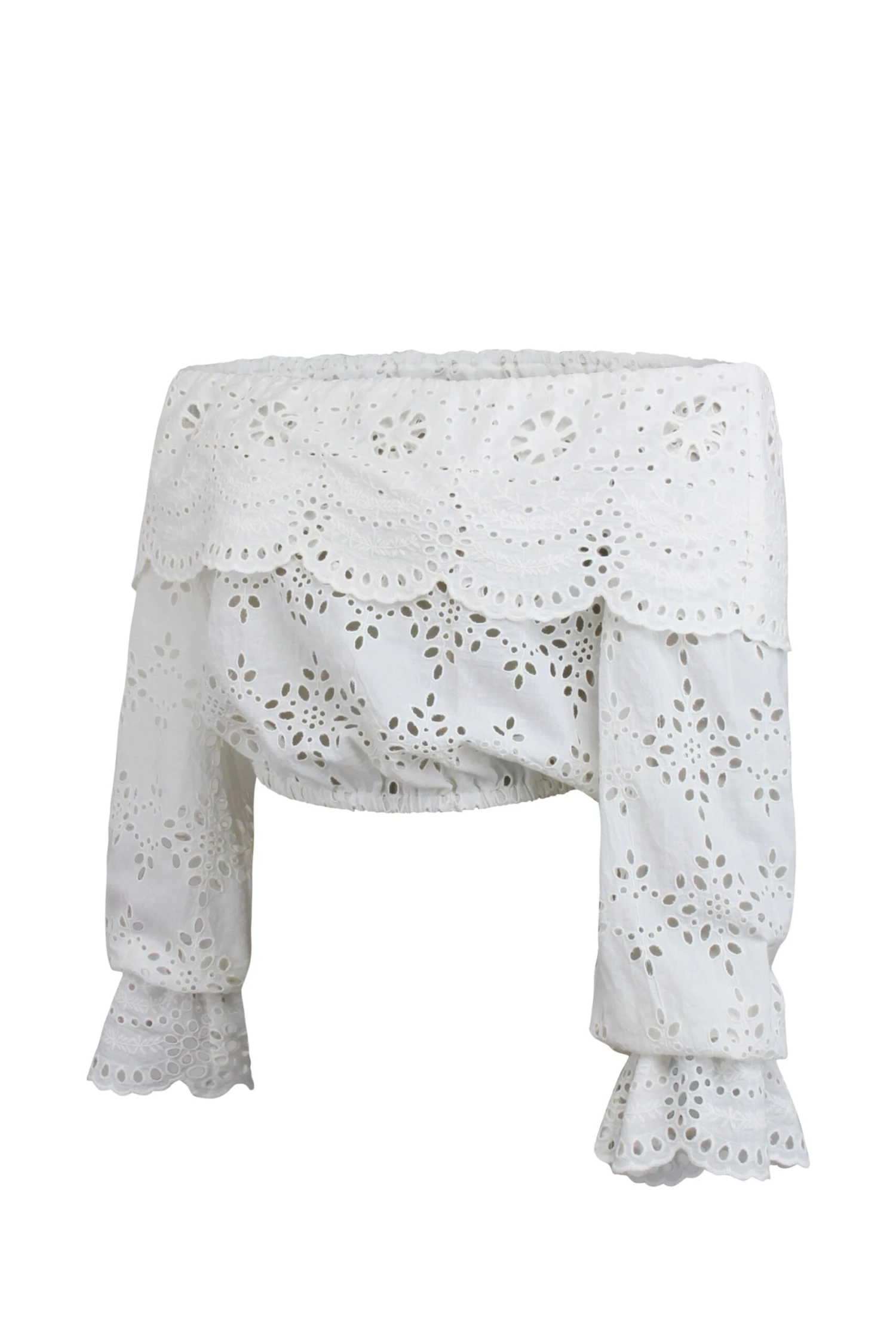 A long sleeved cropped top with deep scalloped edge bardot neckline designed to be worn with our waspie corsets and underbusts. Style with our matching skirts and shorts for a beautiful co-ord