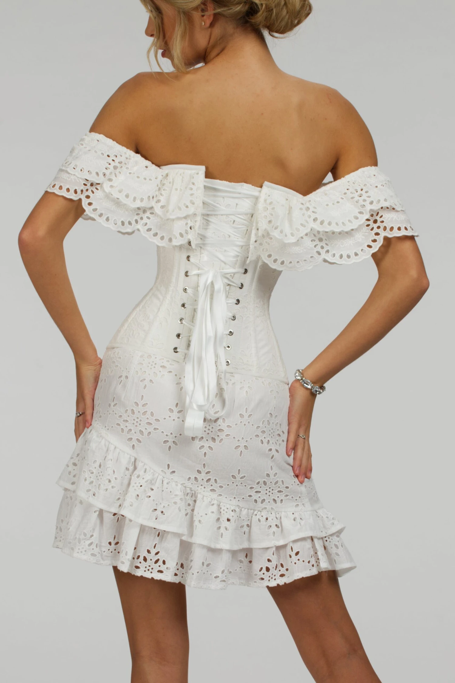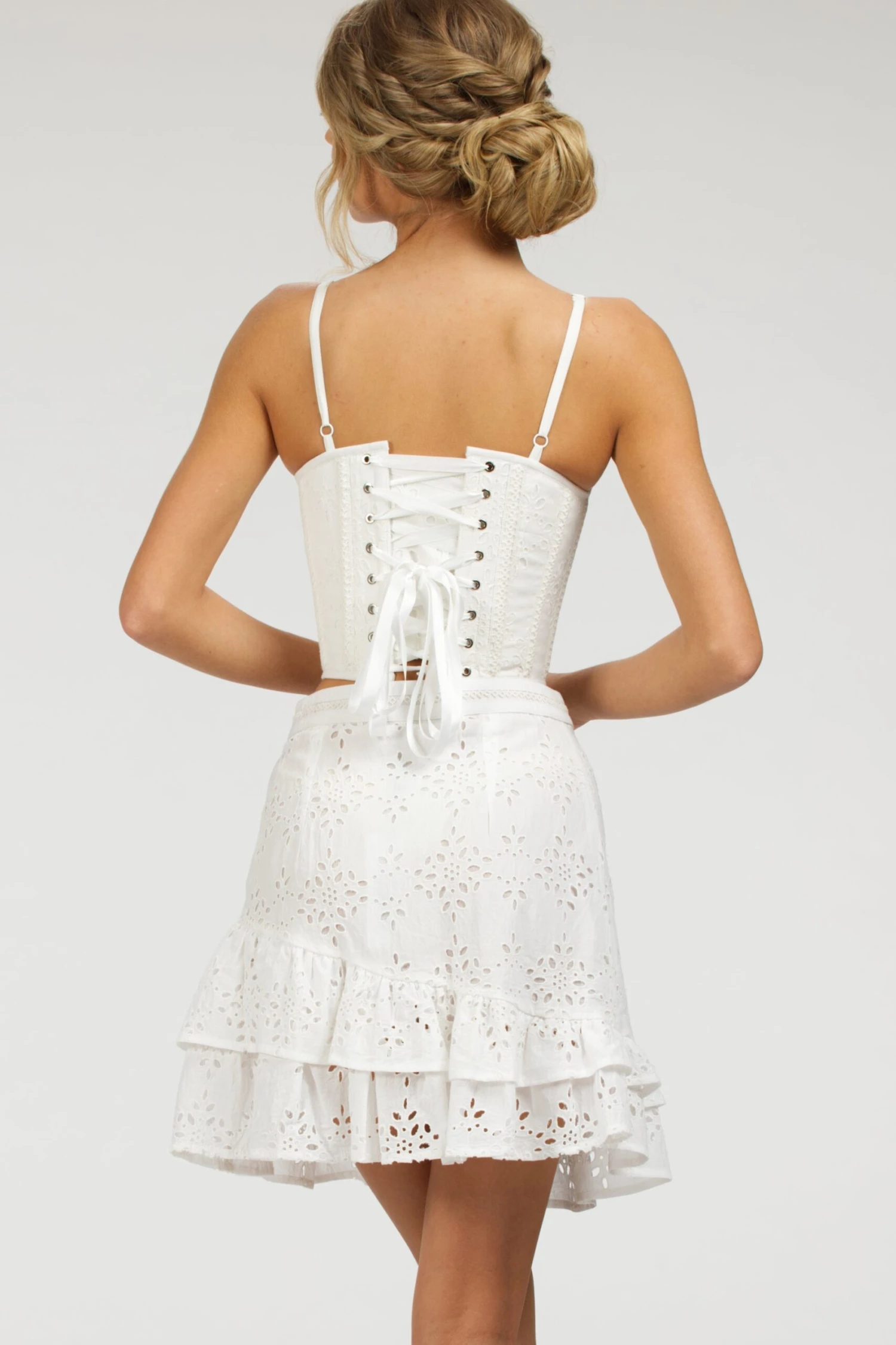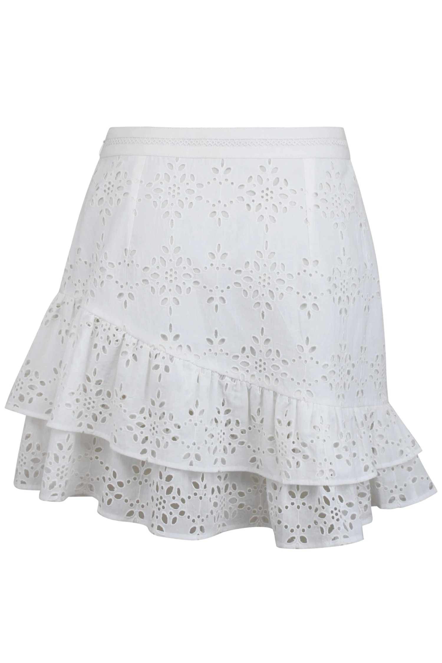 Sammy in white broderie anglaise is the perfect summer skirt. Featuring a double frill hem and intricate waist band detailing it will be in your wardrobe for years to come. Wear it with our other broderie anglaise pieces and create the dream co-ord.