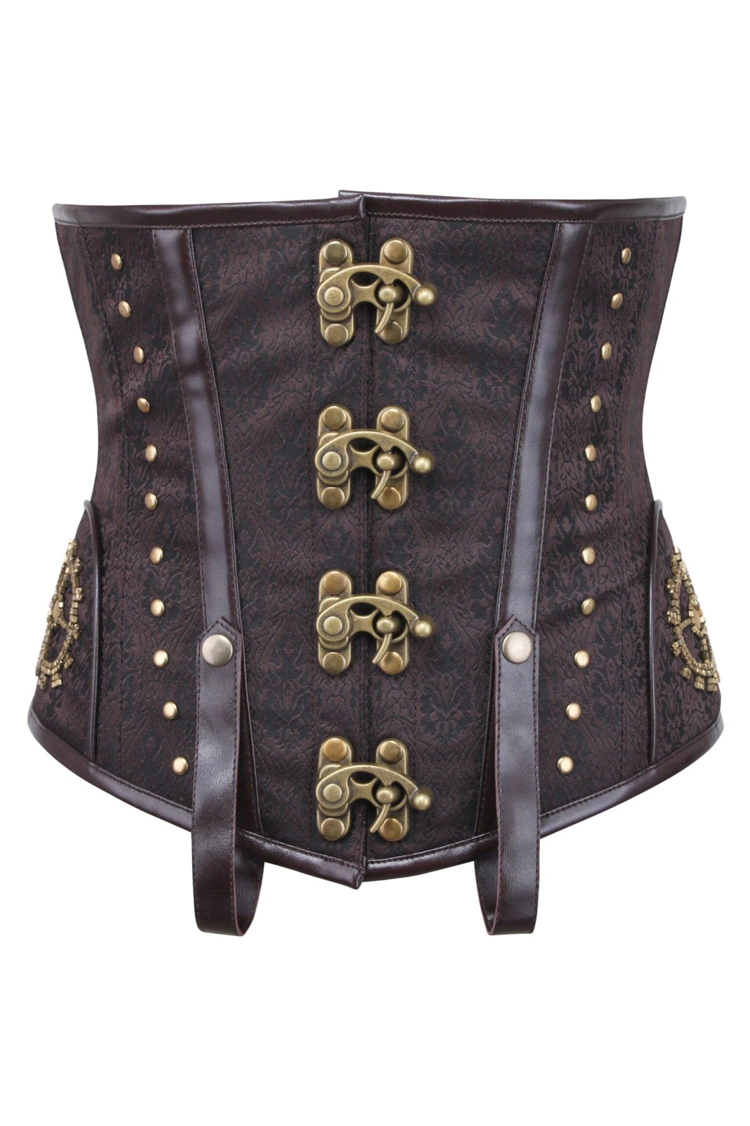 - Corset DesignFeatures: Brocade Pattern, Steampunk Latch Clips, Leatherette Binding, Stud Details, Hip Panel